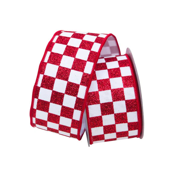 Add a playful pop of pattern to your holiday decorating with this 2.5" x 10yd Red Glitter Checks Ribbon, sparkling with just the right amount of festive glam. The classic check design gets a merry makeover with glitter that catches the light on trees, wreaths, garlands, and gift wrap, instantly making everything feel more special. With its wired edges for easy shaping, this ribbon holds its curls and bows beautifully, giving your décor that polished, designer-finished look all season long.
