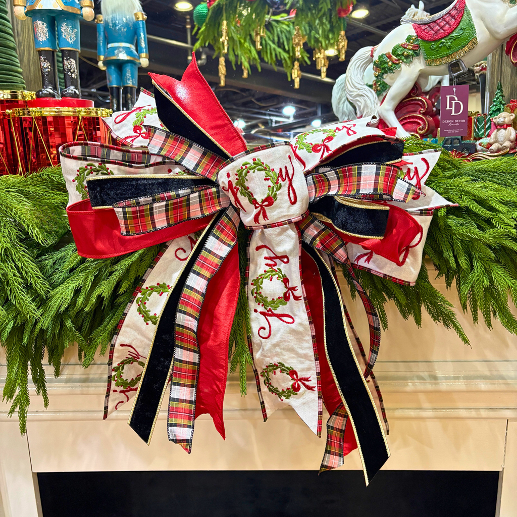 Add a pop of festive charm to your holiday décor with our “Classic Joy” Designer Bow, a bright and cheerful statement piece measuring approximately 20" x 22". Bursting with traditional holiday flair, this handcrafted bow features vibrant plaid, rich red satin, and plush black velvet ribbon, all layered with embroidered “Joy” script and wreath motifs that celebrate the magic of the season.