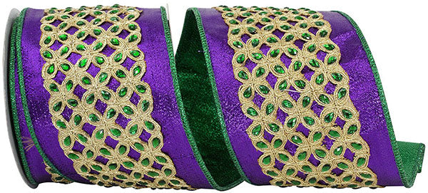 Elevate your Mardi Gras décor with the lavish elegance of our 4" Mardi Gras Jewel Embroidery Deluxe Metallic Wired Edge Ribbon. Featuring ornate jewel-like embroidery in traditional purple, green, and gold on a gleaming metallic background, this ribbon brings a rich, regal touch to any celebration. The wired edge offers excellent structure for dramatic bows and luxe accents, while the 5-yard roll is perfect for adding high-impact style to wreaths, centerpieces, and party displays. Bold, festive, and truly unforgettable.