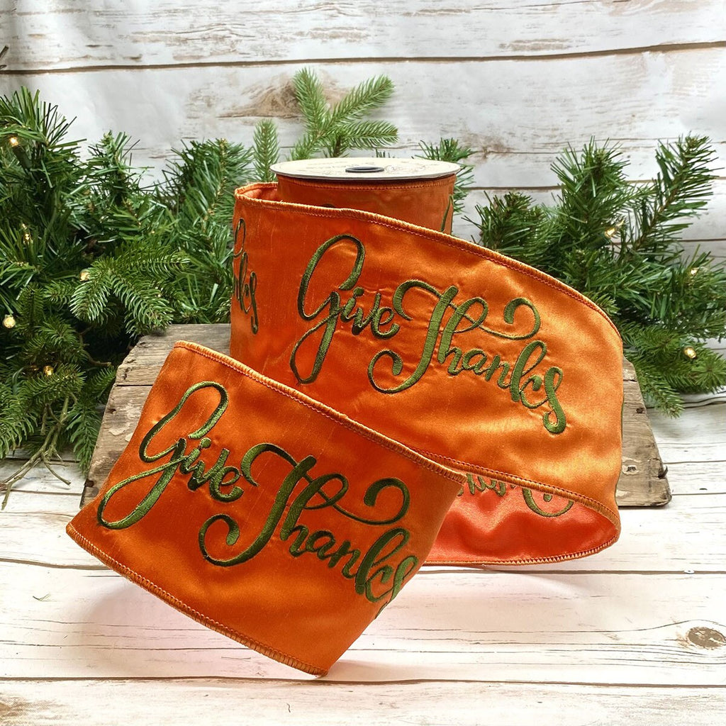 Celebrate the season of gratitude with this 4" faux dupion ribbon in a rich pumpkin orange, featuring elegant "Give Thanks" embroidery in deep green script. The lustrous finish adds sophistication, while the wired edges make it easy to shape into beautiful bows and accents.