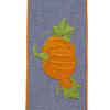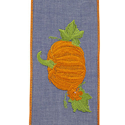 Celebrate the charm of autumn with our 4" x 5 Yards Denim Pumpkin Embroidered Ribbon. This uniquely styled ribbon features rich orange embroidered pumpkins with green leaf accents, beautifully set against a soft denim-blue background. Finished with coordinating orange stitched edges and a wired construction, it’s perfect for shaping elegant bows, adding texture to wreaths, garlands, centerpieces, and seasonal gift wrapping. A whimsical yet refined touch, this ribbon brings handcrafted detail and festive flair to your fall décor.
