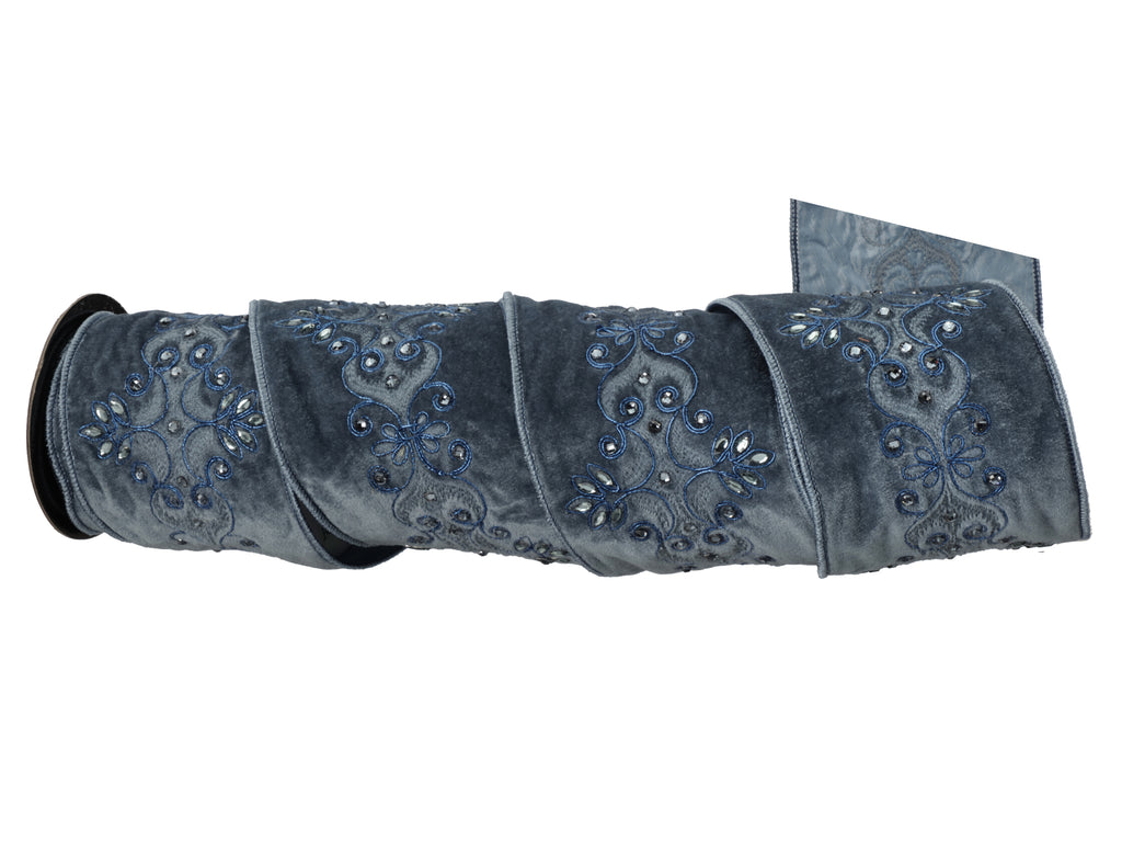 Elevate your holiday decorating with the luxurious look of the Blue & White Embroidered Dupion Ribbon. Measuring 4 inches wide and 5 yards long, this ribbon features a rich velvet-like dupion fabric adorned with elegant embroidered scrollwork and jewel-like accents in shades of blue and white.
