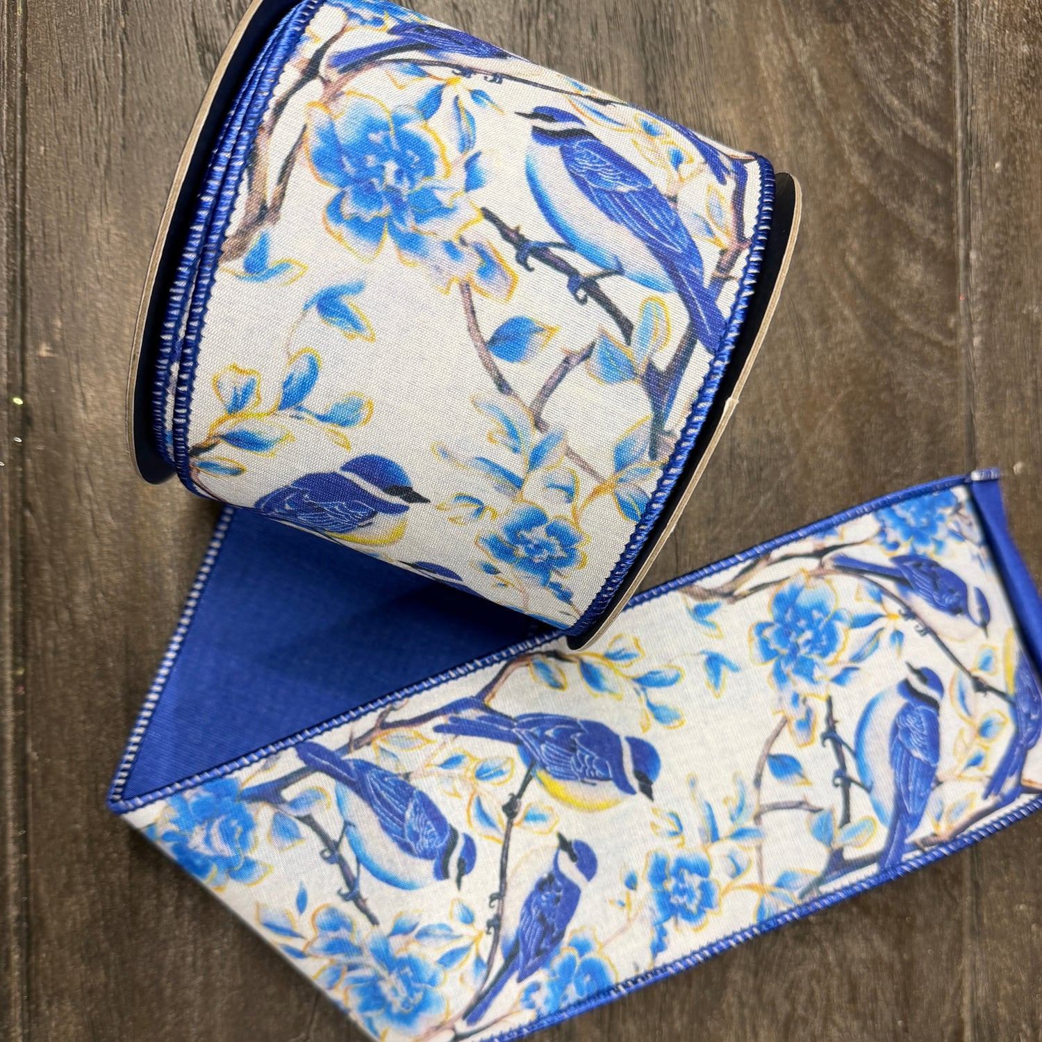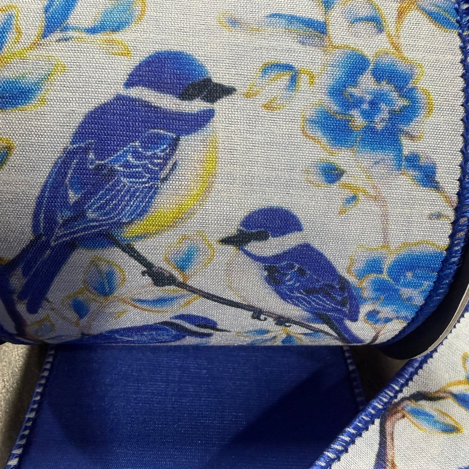 Bring serene beauty and natural charm to your decor with our 4" x 10yds Blue Bird Perched Deluxe Dupioni Backed Wired Edge Ribbon. Featuring delicately illustrated blue birds perched among soft botanical elements, this ribbon captures a peaceful, painterly elegance perfect for spring and year-round displays. The rich dupioni backing adds luxurious texture and structure, while the wired edges make it easy to create full, graceful bows and tailored accents. Ideal for wreaths, centerpieces, and elegant gift wrapping, it’s a refined, nature-inspired detail with a designer finish.