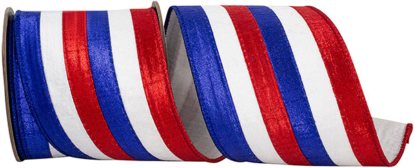 Show your patriotic pride in style with our 4" x 5yds Patriotic Metallic Stripes Deluxe Dupioni Backed Wired Edge Ribbon. Featuring bold red, white, and blue stripes with a metallic shimmer, this ribbon adds festive flair with a touch of elegance. The deluxe dupioni backing provides a rich texture and sturdy structure, while the wired edges make it easy to craft full, dramatic bows and polished accents. Perfect for Fourth of July wreaths, Memorial Day displays, or year-round Americana decor, it’s a standout ribbon that blends celebration with sophistication.