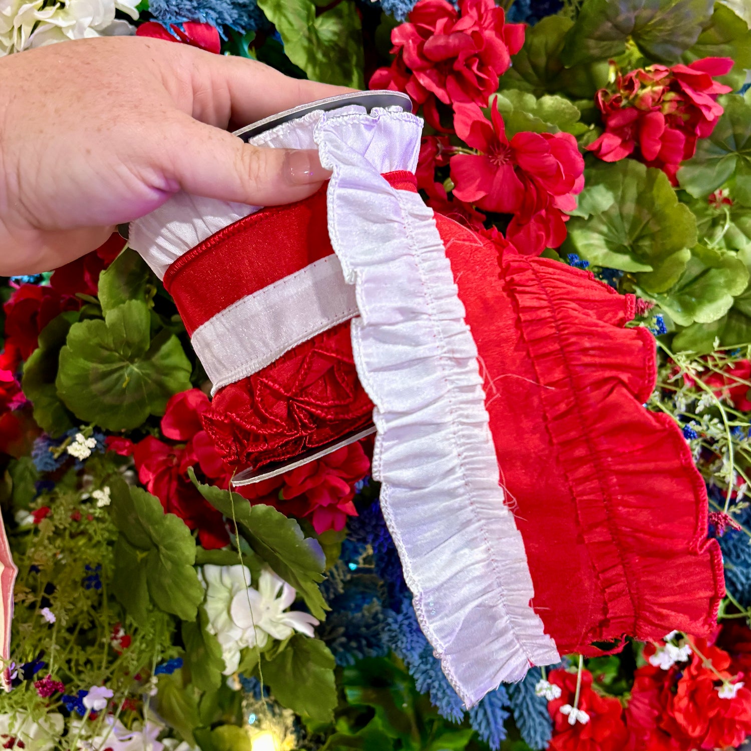 Bring playful elegance to your designs with our 4" x 5yds Ruffle Festivity Deluxe Dupioni Wired Edge Ribbon. This standout ribbon features charming ruffled edges paired with rich dupioni fabric, blending texture, movement, and a touch of whimsy. The wide format and wired edge make it ideal for creating voluminous bows and showstopping accents on wreaths, garlands, or festive tablescapes. Whether used for holiday cheer or year-round celebration, this ribbon adds a designer flourish that's both joyful and refined.