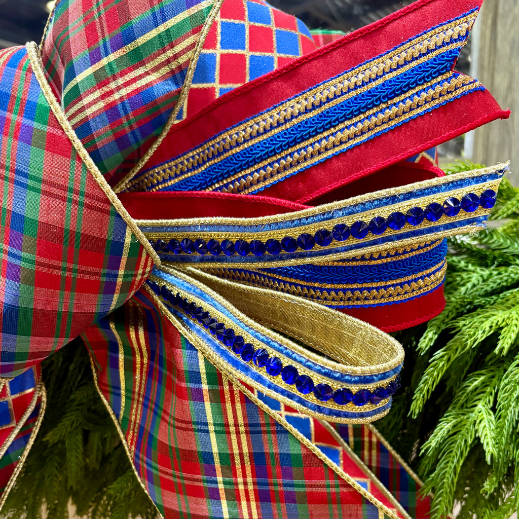 Nutcracker Royale Christmas Bow Bring the drama and delight of the season’s most beloved ballet to your holiday décor with the Nutcracker Royale bow. Featuring a striking mix of bold blues, festive reds, golden trims, and classic tartan, this handcrafted design captures the magic of timeless tradition with a regal twist. Perfect for wreaths, garlands, or tree toppers, this bow adds a statement of festive grandeur wherever it’s placed.