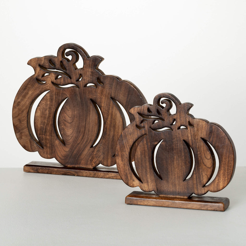 This set of two wooden pumpkins features an elegant carved silhouette with subtle leaf detailing. The rich brown finish and sturdy base make them ideal for shelf, tabletop, or entryway styling throughout the fall season.