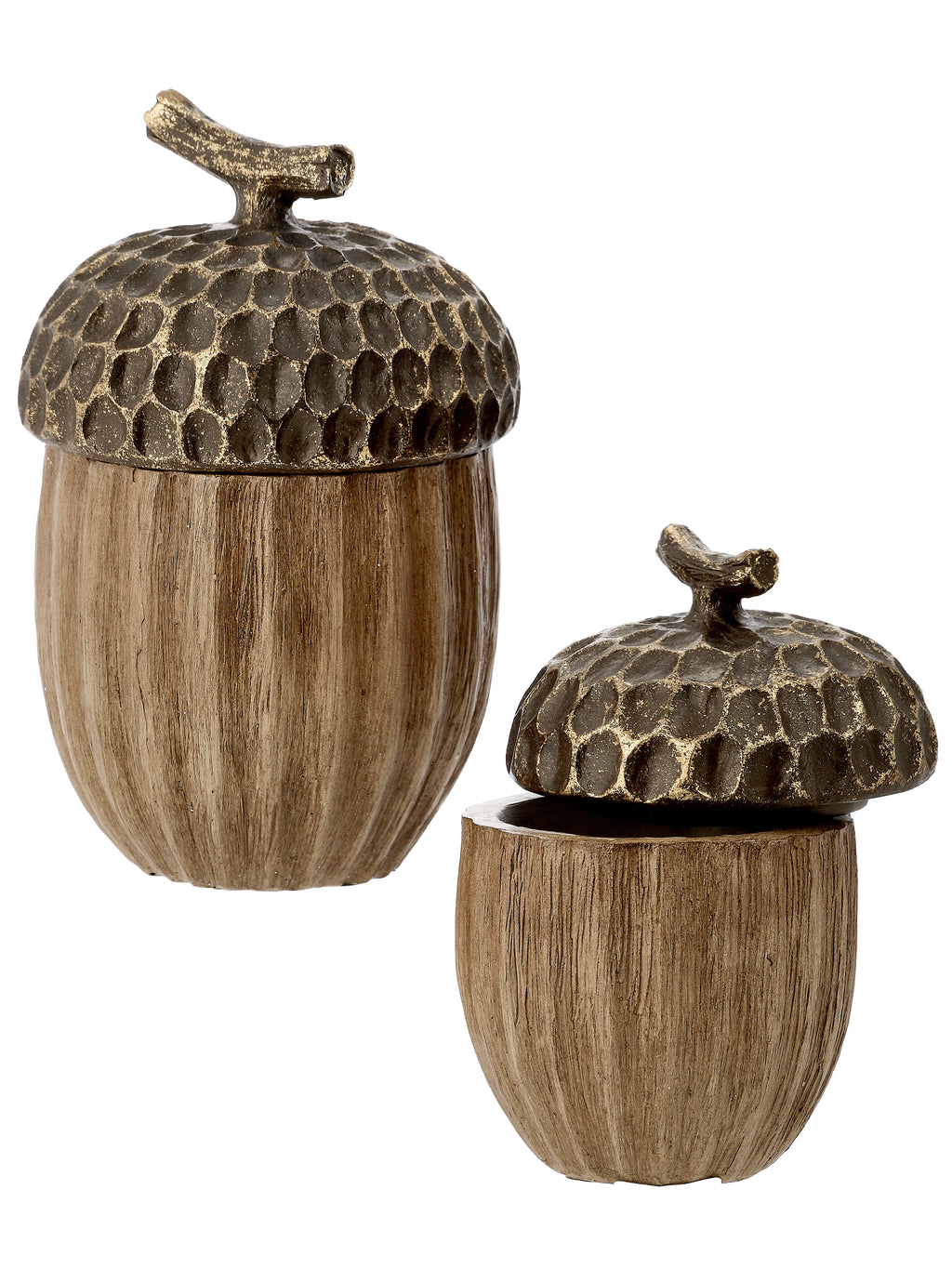 Add a whimsical yet sophisticated touch to your seasonal décor with our 6–7.5" Resin Acorn Jars. Beautifully crafted with a rich woodgrain texture and antique bronze-finished tops, these charming acorn-shaped jars blend rustic elegance with functional design. The removable lids reveal hidden storage—perfect for tucking away treats, trinkets, or tabletop treasures. Whether styled on a console, coffee table, or as part of a harvest centerpiece, this jar instantly elevates your autumnal vignettes. A curated accent for the discerning decorator who adores details that feel both playful and polished.  Each sold separately.