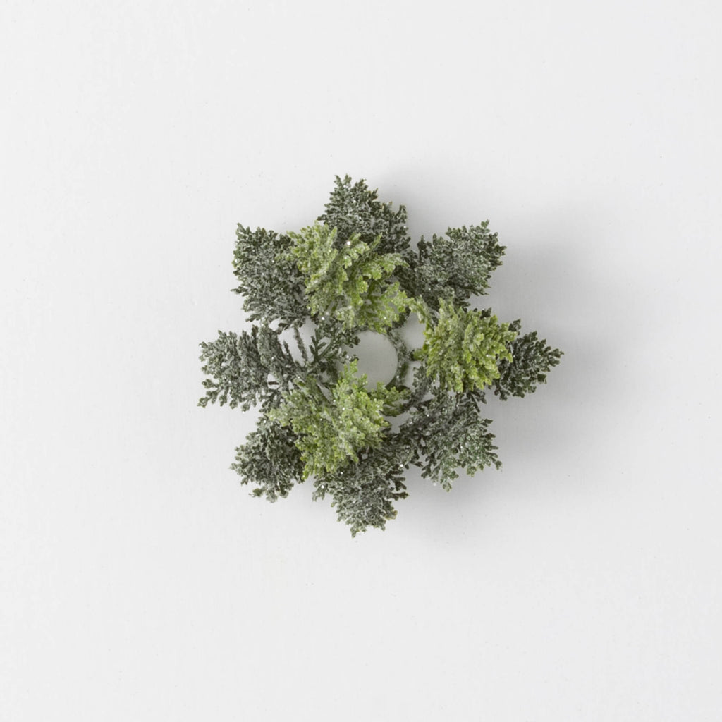 Elevate your seasonal decorating with our 1" Cypress Ring in Green—a petite yet lush accent designed to bring refined, wintry charm to your space. Featuring real-touch faux cypress greenery dusted with a delicate icy shimmer, this mini ring is perfect for adding texture and elegance to taper candle bases, napkin settings, or tiered trays. Its lifelike detail and soft, frosted finish offer a sophisticated, nature-inspired touch without the mess or maintenance of real foliage. Beautifully understated, this versatile piece integrates seamlessly into your curated holiday or winter décor collection.