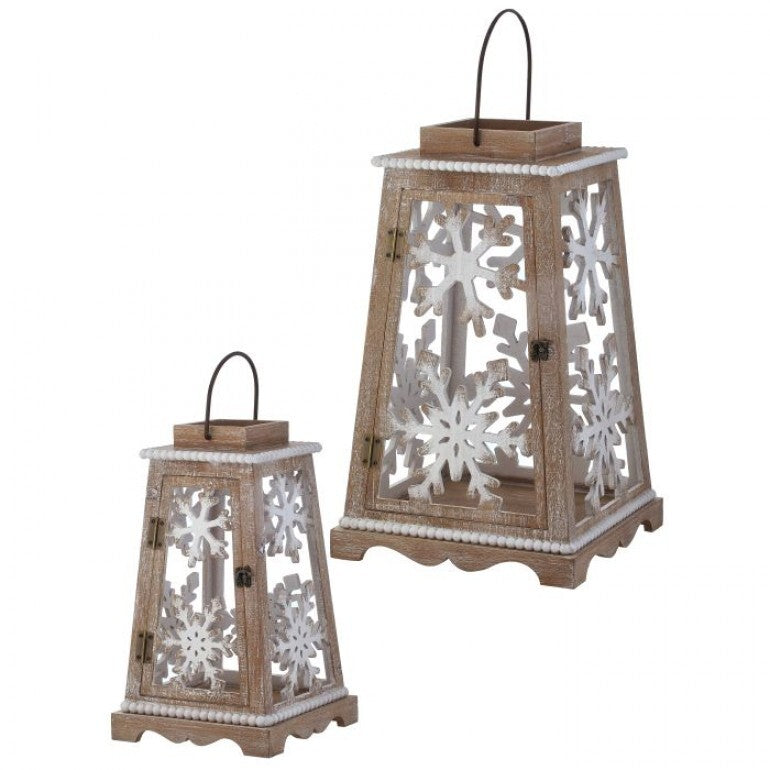 Illuminate your holiday season with our 13.5"-18" Snowflake Lantern Set/2. Made of natural light wood and metal, these Christmas tabletop decorations will add an elegant touch to any room. Keep them out all winter for a festive and exclusive atmosphere.
