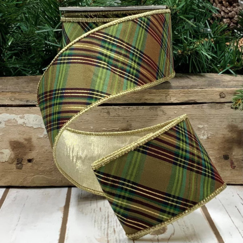 This 2.5" x 10 YDS Metallic Green & Gold Dupion Abbey Lane Plaid Ribbon features a rich dupion fabric with a sophisticated plaid pattern in deep green, metallic gold, and subtle ivory accents. The lustrous finish and wired edges provide both elegance and structure, making it ideal for refined holiday décor, wreaths, bows, and upscale gift wrapping.