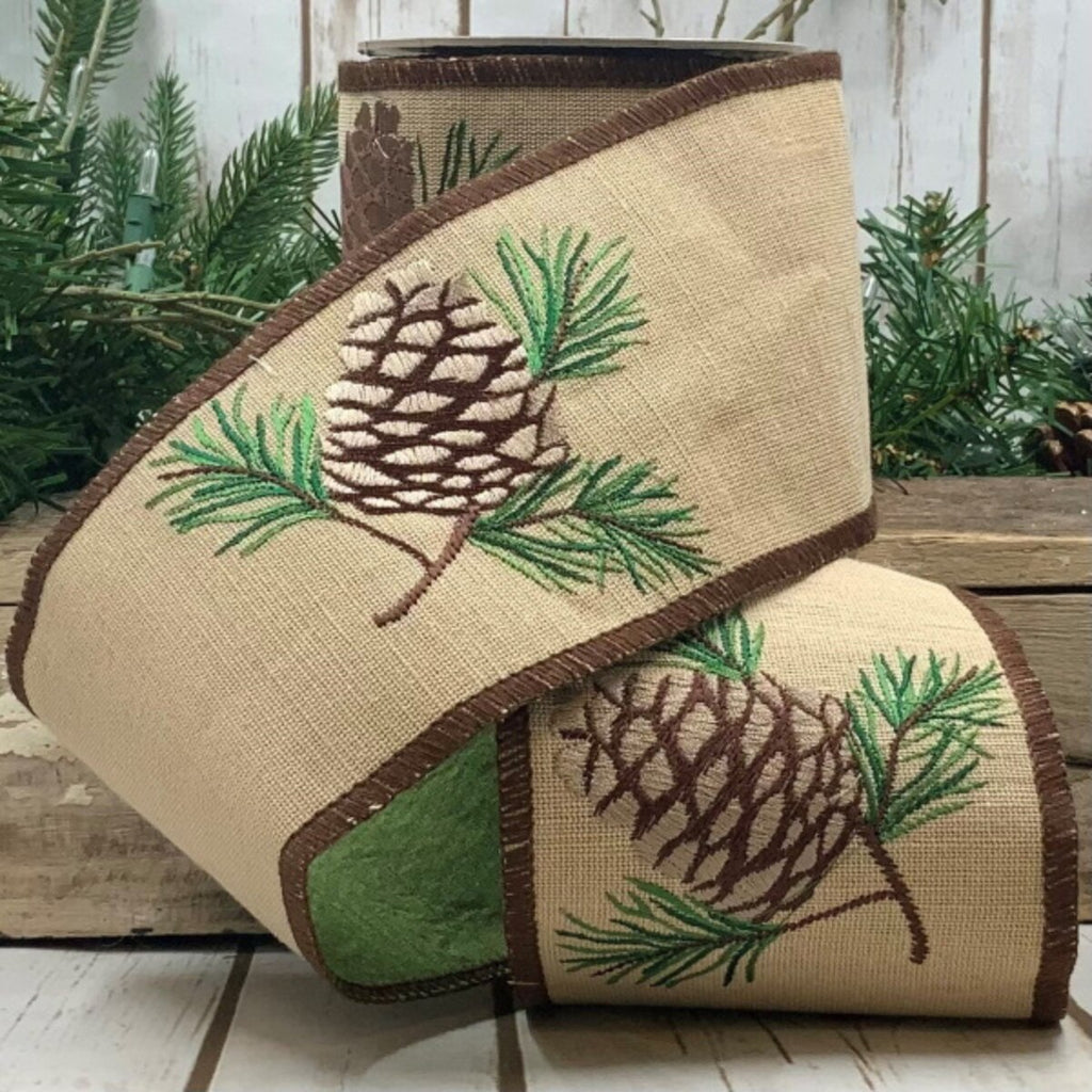 This 4" x 5 YDS Canvas Embroidered Brown Pinecone Ribbon features a natural canvas base adorned with intricately embroidered pinecones and green pine needles. The rich brown stitched edges and wired sides provide both durability and shape retention. Perfect for rustic holiday décor, winter wreaths, and woodland-themed arrangements.