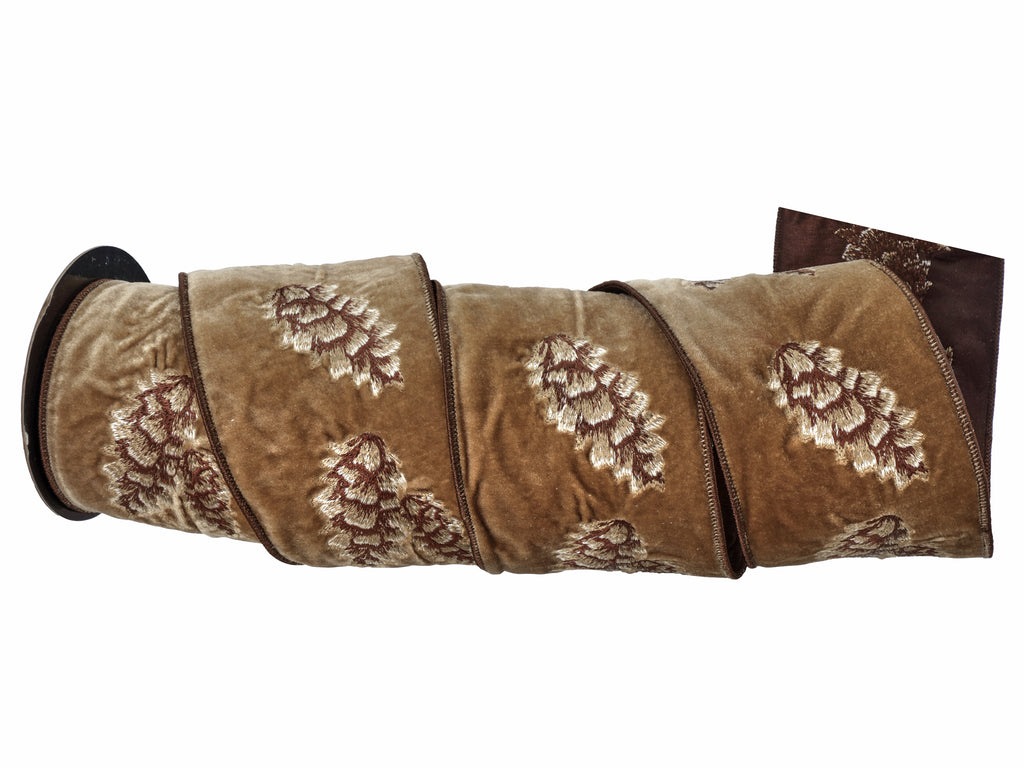 4" x 5YDS Brown Embroidered Suede Pinecone Ribbon