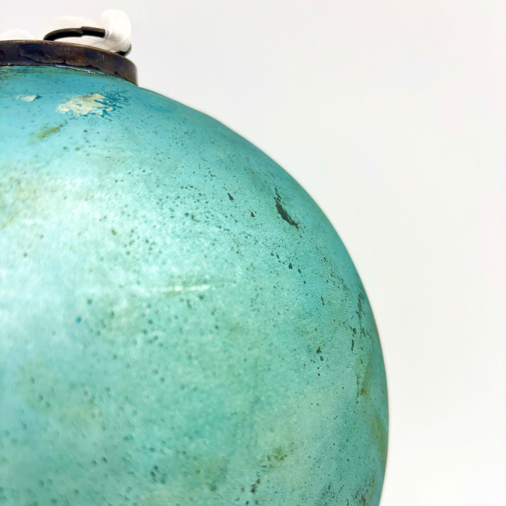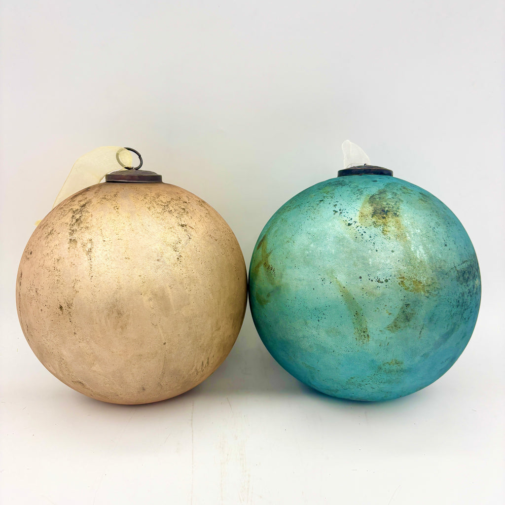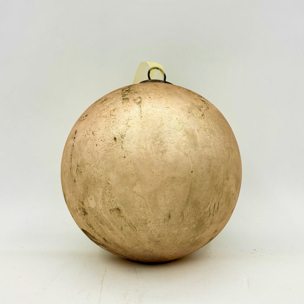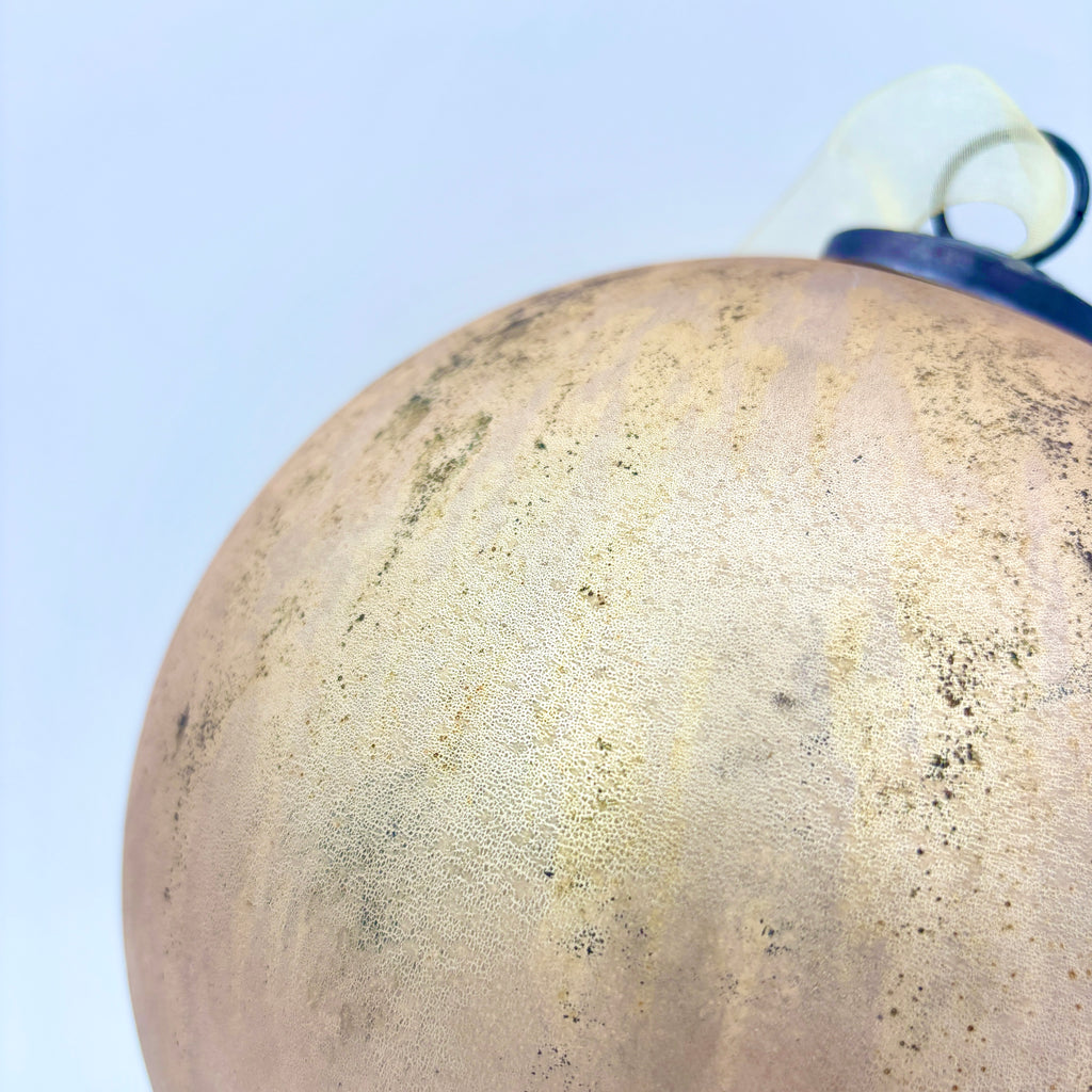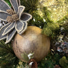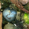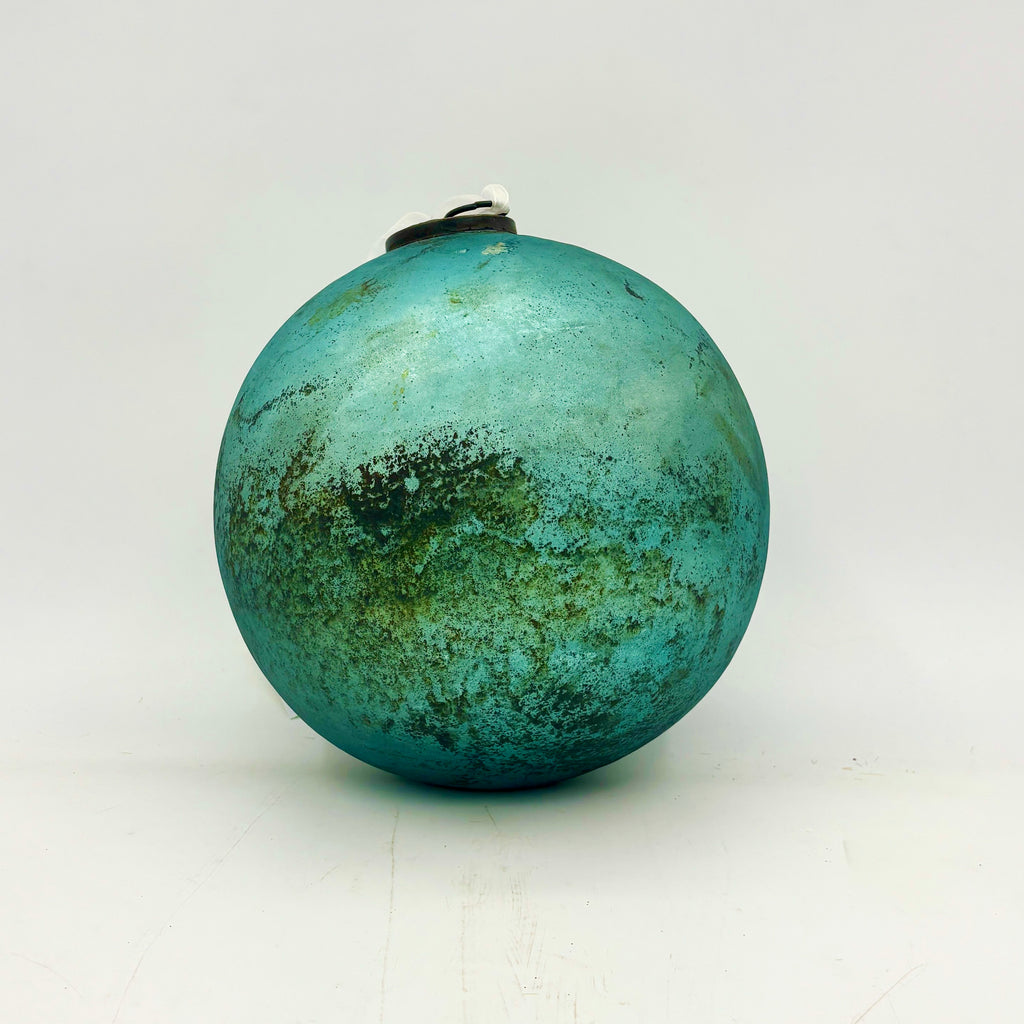 This 8" Antique Rustic Ball Ornament features a weathered, vintage-inspired finish in muted green or brown with rich bronze and black patina accents. The aged texture and distressed detailing give it an old-world charm, while the metal cap and sheer ribbon hanger add a touch of elegance. Ideal for creating a refined, timeworn aesthetic in holiday trees, mantels, or decorative bowls. Each ornament sold separately.