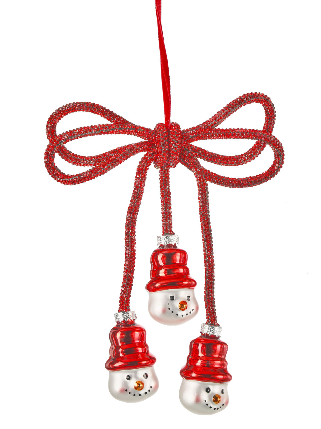 This enchanting ornament features three glossy glass snowmen with cheerful expressions, topped in brilliant red hats and suspended from a glittering red rope bow. At 6.5 inches long, it adds playful movement and elegance to any tree, wreath, or festive garland.