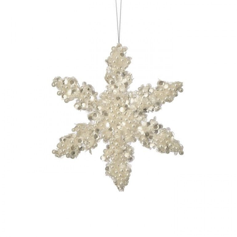 Bring frosty elegance to your holiday décor with this shimmering iced snowflake ornament. Designed in a classic six-pointed shape, each piece is adorned with sparkling sequins and delicate pearl accents that catch the light beautifully. Available in 6-inch or 8-inch sizes (each sold separately), these snowflakes are perfect for decorating Christmas trees, garlands, wreaths, or even as standalone accents for a winter wonderland look.