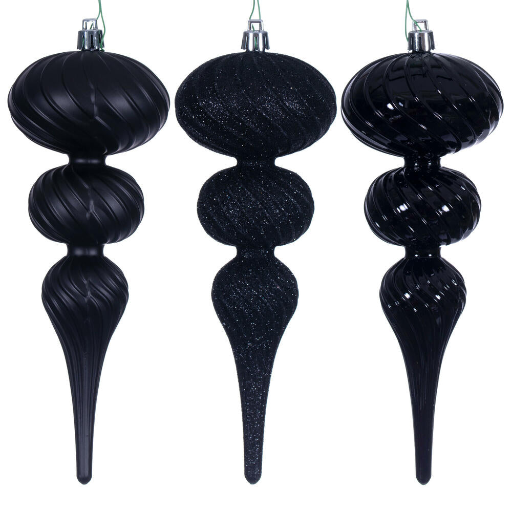 Make a bold statement with the Vickerman 8" Black Swirl Finial Ornament Assortment. This striking set features six intricately designed finials in three elegant finishes—two matte, two shiny, and two glitter—offering a dynamic mix of texture and depth.