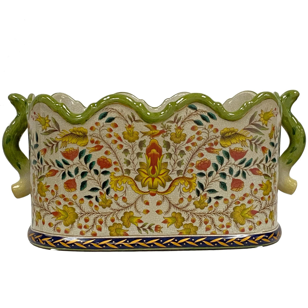 This hand-painted floral cachepot is a celebration of color, craftsmanship, and classic European garden style. Measuring 15" long by 8" wide, it features a softly scalloped rim in glossy green, whimsical side handles, and an intricate all-over floral motif in rich yellow, coral, and green tones.