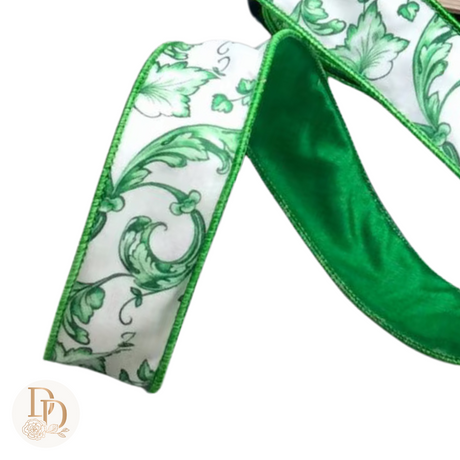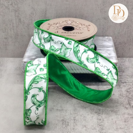 1.5" Green | White | Chinoiserie | Taffeta Acanthus Scroll Ribbon- 10 Yards