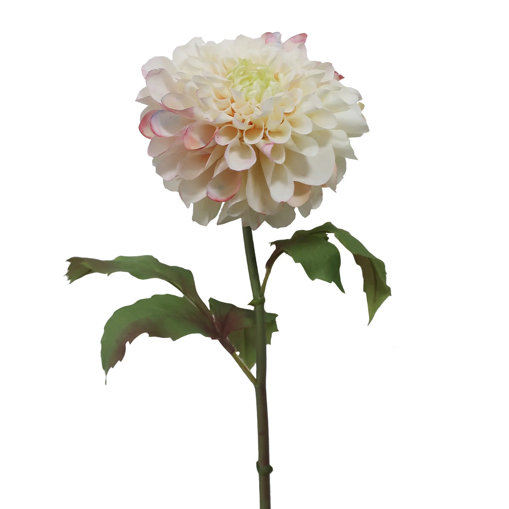 Crafted with a realistic green stem and leafy foliage, this faux dahlia adds elegance whether styled solo in a bud vase or clustered into a lush seasonal bouquet. The soft tones blend beautifully with pastels or deeper florals, making it a versatile staple in any faux floral collection.