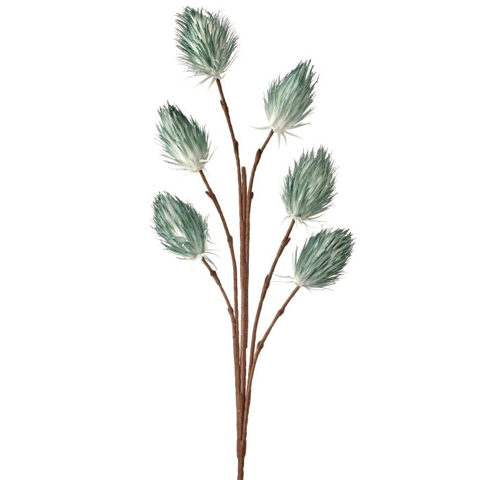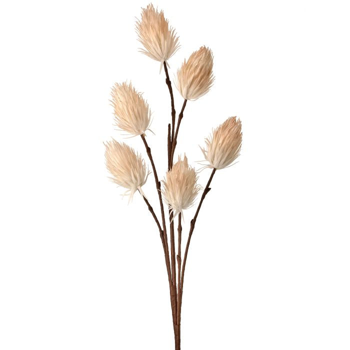 Wild, airy, and effortlessly modern—this 46" faux thistle stem features six uniquely textured blooms crafted from lightweight foam for a soft, sculptural feel. The elongated silhouette and natural branching make it a striking standalone stem or an elegant addition to dried-style arrangements.