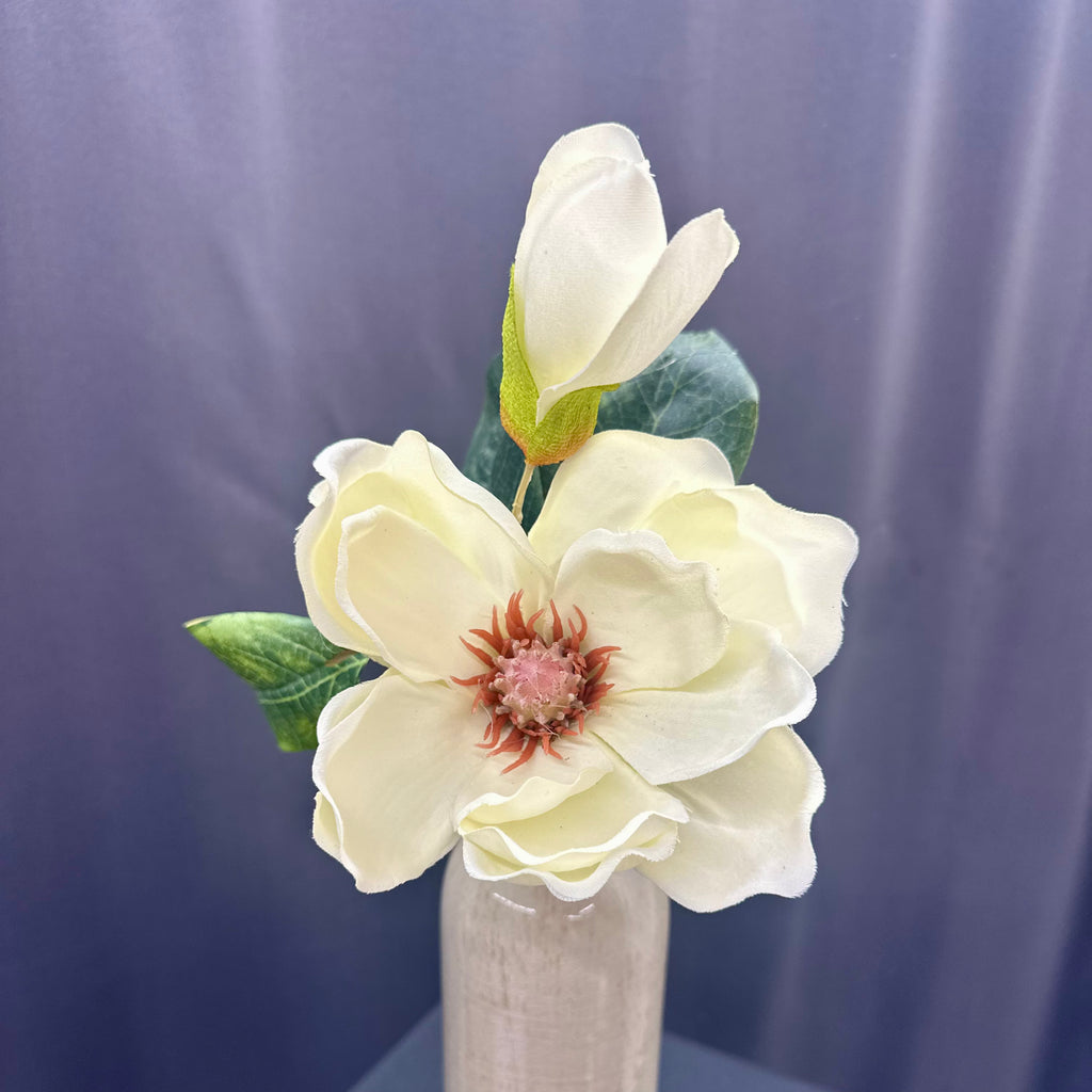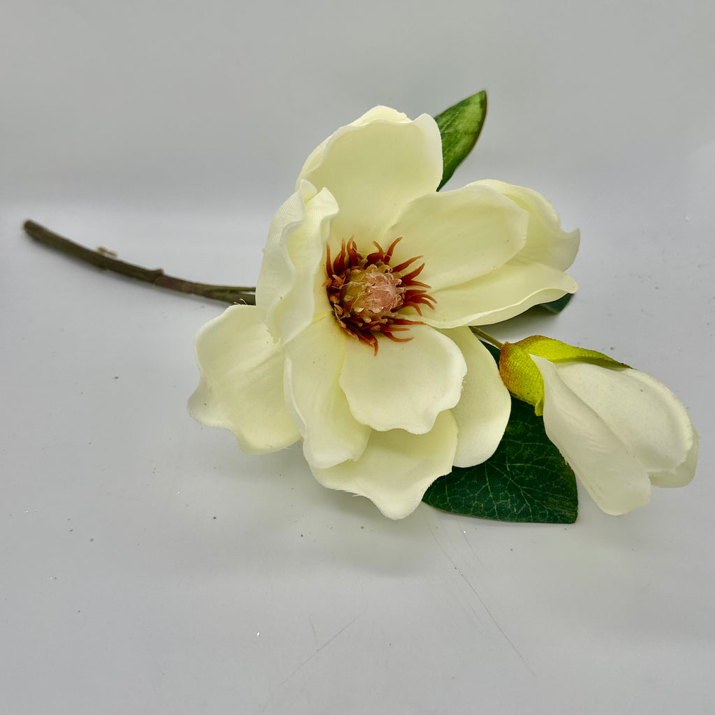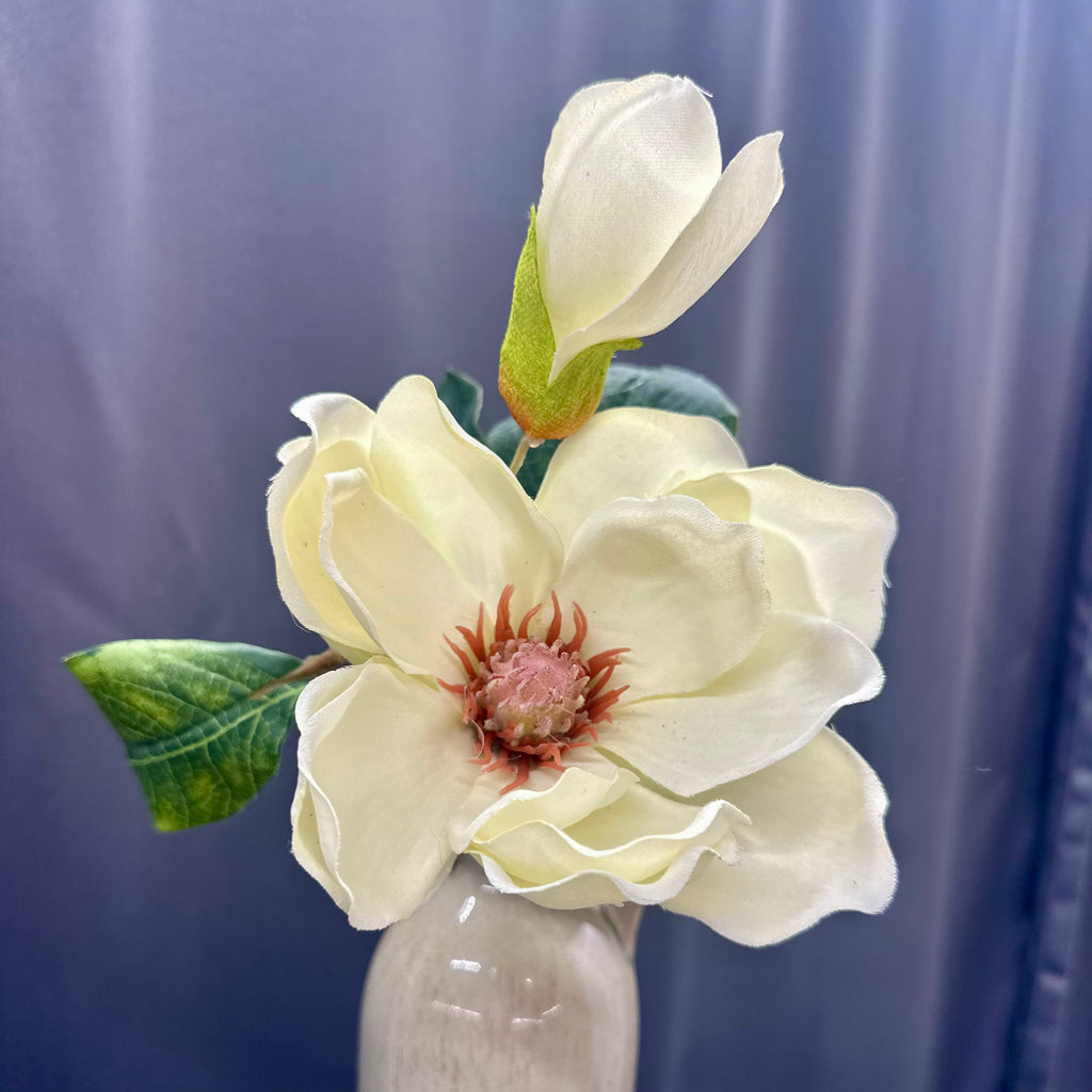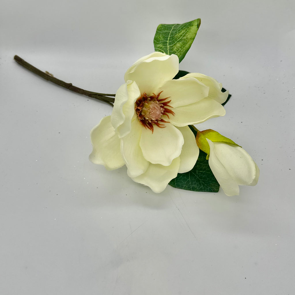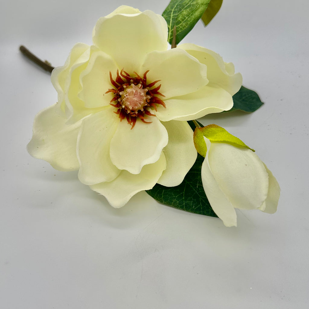 This beautiful 14" Cream/White Magnolia & Bud Pick is the perfect addition to any floral arrangement or home decor. The delicate cream and white petals, paired with the vibrant green leaves and buds, will add a touch of elegance and charm to any space. Crafted with high-quality materials, this pick is sure to impress and last for seasons to come.