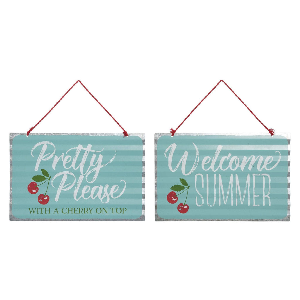 Featuring soft aqua stripes, bright red cherries, and white script lettering, each sign is framed with a galvanized metal edge and hangs effortlessly from a red cord. At 11.8" x 0.3" x 7.8" and weighing just 7.84 oz, they’re lightweight and easy to display anywhere you want to usher in those carefree, sun-kissed vibes.