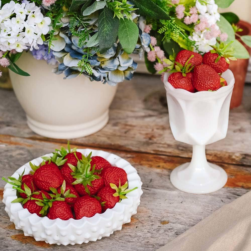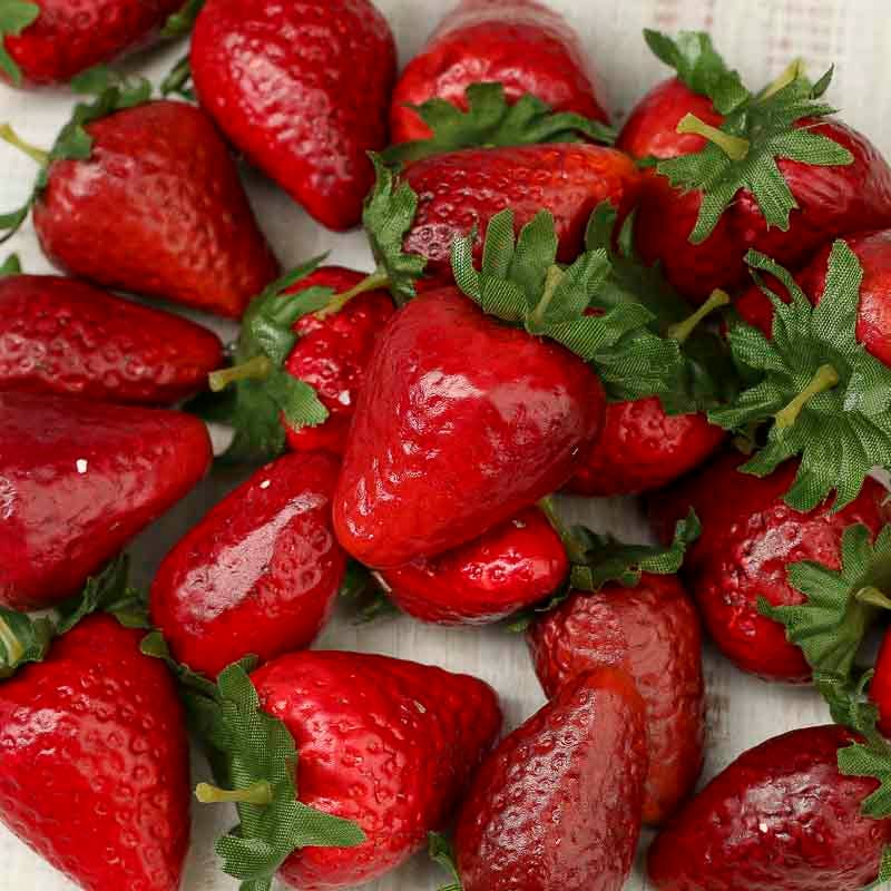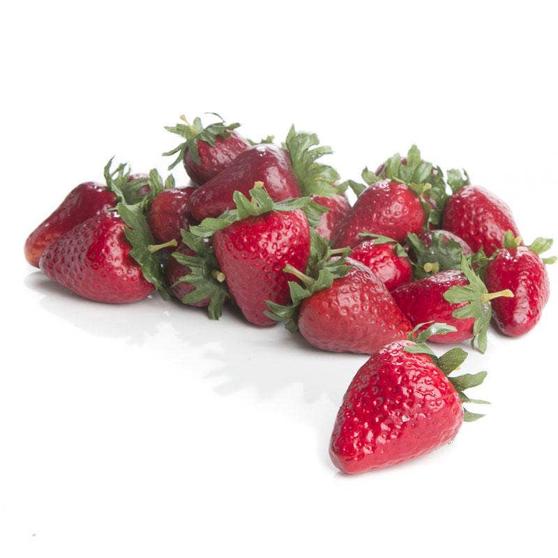 1.75" Faux Strawberries are a perfect fake food—they definitely look good enough to eat! The artificial strawberries consist of perfectly ripe-looking fruits, transitioning from vibrant red to deeper reds, complete with seed divots for texture. Their characteristic shapes, top green leaves, and stems add a touch of realism.