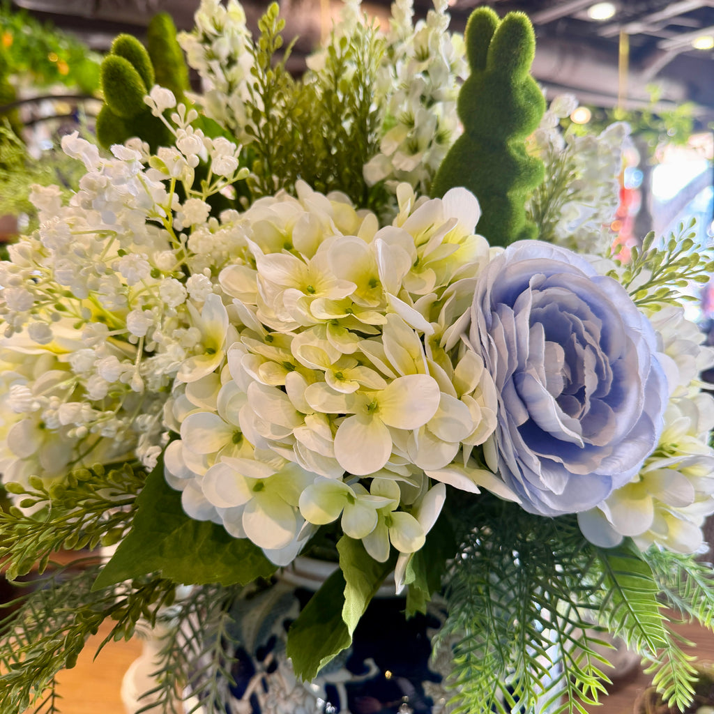 Whimsical meets timeless—“Bunny Trail Blossoms” is a fresh spring statement designed in a 16.5" blue & white ornate ginger jar and overflowing with soft, airy florals. Lush white hydrangea sets the foundation, layered with delicate baby’s breath, creamy white delphinium, and light blue ranunculus for a crisp, elegant color story. Finished with seeded greenery, textured greens, and charming bunny moss picks, this arrangement brings an elevated Easter touch to entry tables, mantels, or kitchen islands—sweet, sophisticated, and completely effortless.