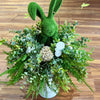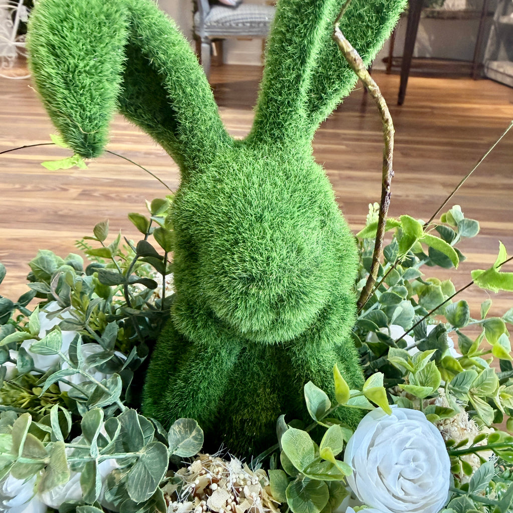 The "Hoppy" Centerpiece: A tall, moss-covered bunny figurine sits nestled at the heart of the greenery, providing a soft, velvety texture and a touch of woodland charm.