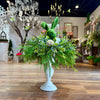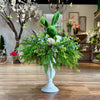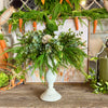 Elegant Pedestal Base: The arrangement is presented in a classic, white-distressed ceramic pedestal urn, elevating the design for a formal yet rustic look.