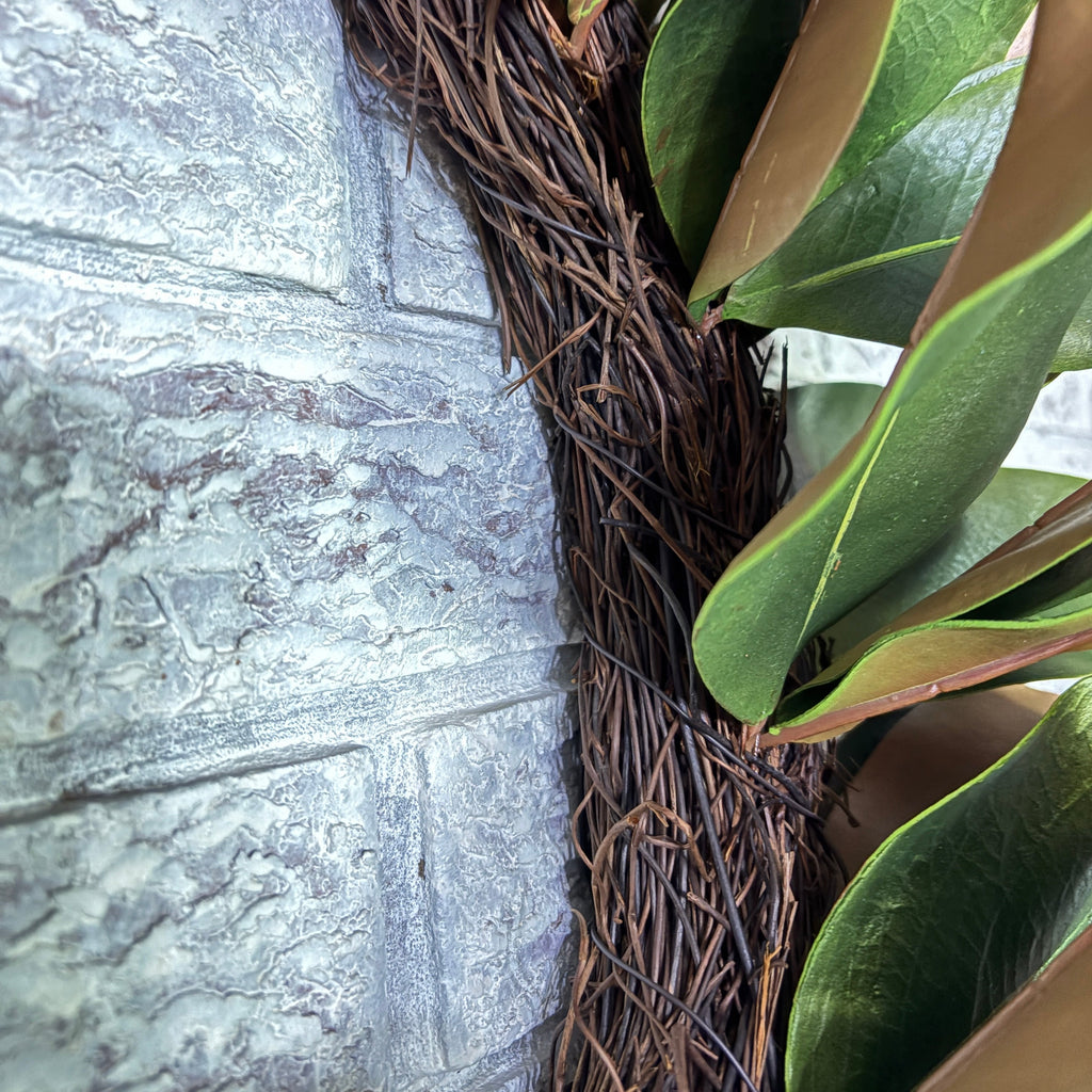 Adorn your space with the 26" Natural Look Magnolia Wreath, a sublime homage to nature’s elegance. Crafted with meticulous attention to detail, this magnificent piece evokes the allure of Southern grandeur, infusing your surroundings with a timeless charm that whispers of sophistication and grace. Perfect for those who appreciate the artistry of understated beauty.