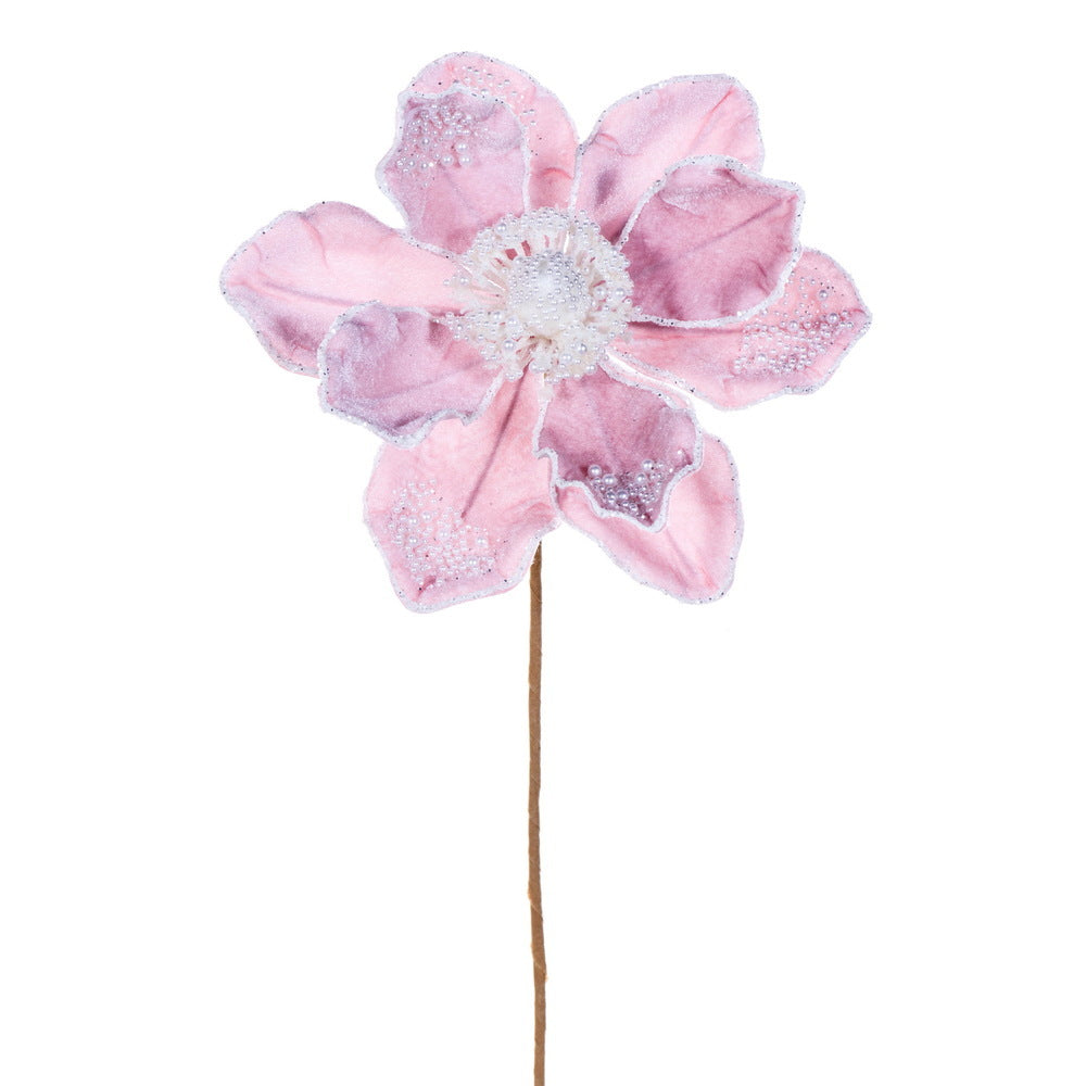 Add a soft, romantic touch to your holiday décor with the 17" Pink Velvet Pearl Magnolia Stem. Crafted from blush velvet and adorned with delicate pearl accents and glittery details, this bloom brings a whimsical charm to any festive arrangement.