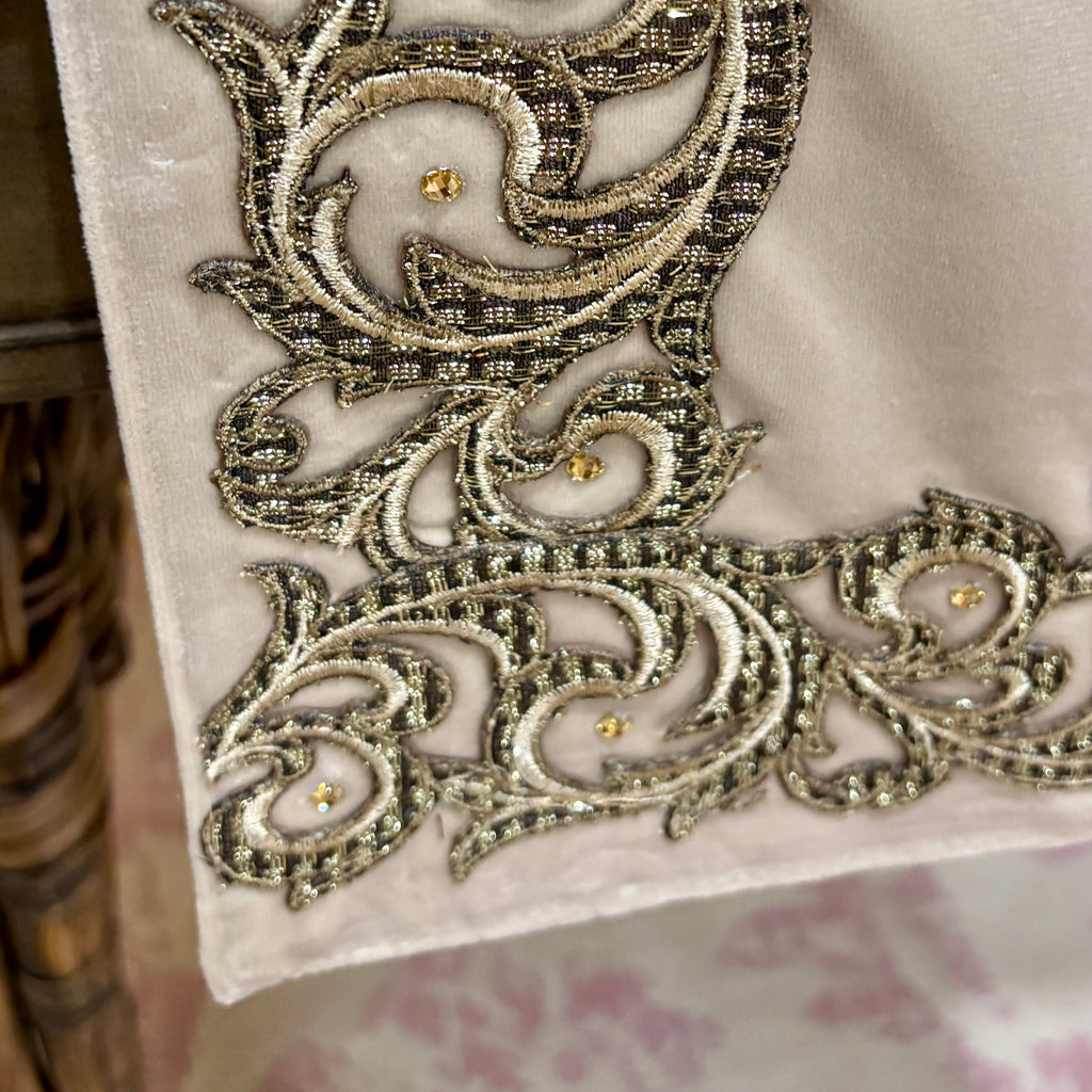 Elevate your dining experience with our opulent 13" x 72" champagne embroidered scroll velvet table runner. Crafted with high quality materials, this luxurious runner will add a touch of sophistication to any Christmas table. Indulge in the finer things and make a statement with our exclusive design. Matching tree skirt available.