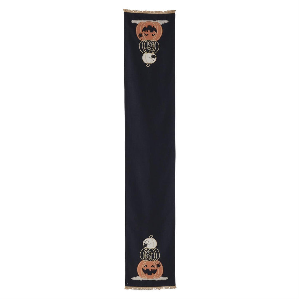 Add a sophisticated seasonal accent to your table with this 27-inch black Halloween table runner, featuring a charming stitched design of stacked jack-o’-lanterns. Crafted from high-quality black fabric, the runner showcases embroidered pumpkins in a vertical arrangement at each end—each pumpkin intricately detailed with varying expressions, spider web motifs, and subtle star accents. The color palette blends classic orange, ivory, and muted gray tones, offering a refined Halloween aesthetic. Finished with soft fringe trim on both ends, this runner brings a handcrafted, whimsical charm to any autumnal display. Ideal for layering on a dining table, console, or mantel, it adds texture and visual interest while anchoring your Halloween decor with timeless style.