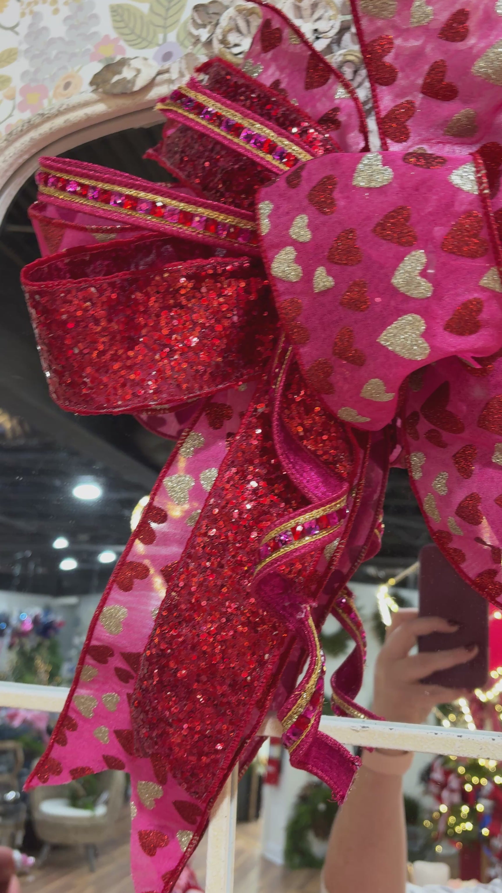 Bold, sparkly, and unapologetically glamorous — our 18" Jeweled Magenta Glam Bow is made to stand out. Layers of deep pinks, radiant red sequins, and heart-dusted ribbon come together in a dazzling display of Valentine’s flair.
