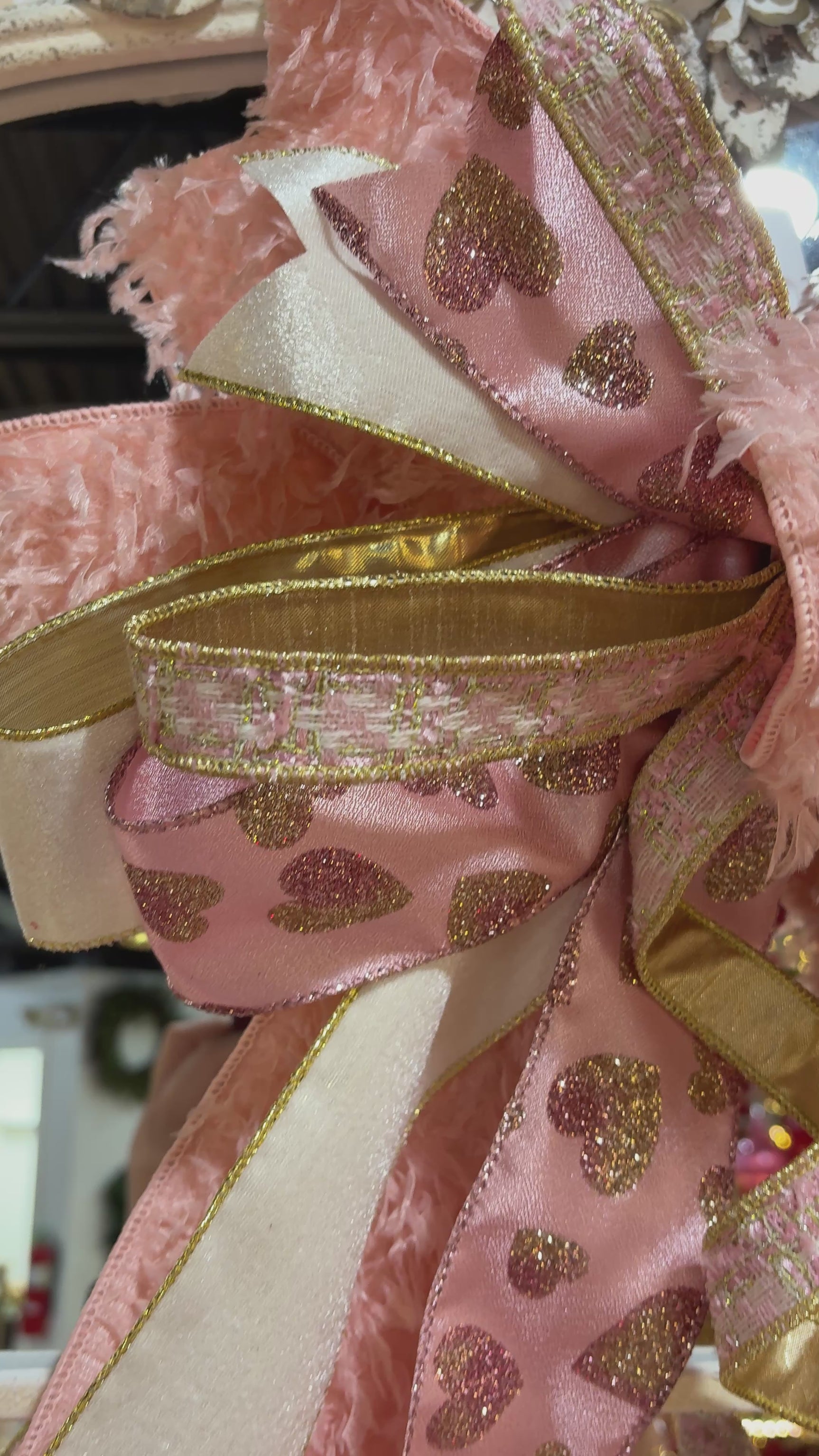 Add a playful pop of romance to your Valentine décor with our 18" Sweetheart Shimmer Bow. Designed with layers of plush blush textures, glimmering gold trim, and glittered heart ribbon, this designer-crafted bow is full of charm, sparkle, and soft whimsy.