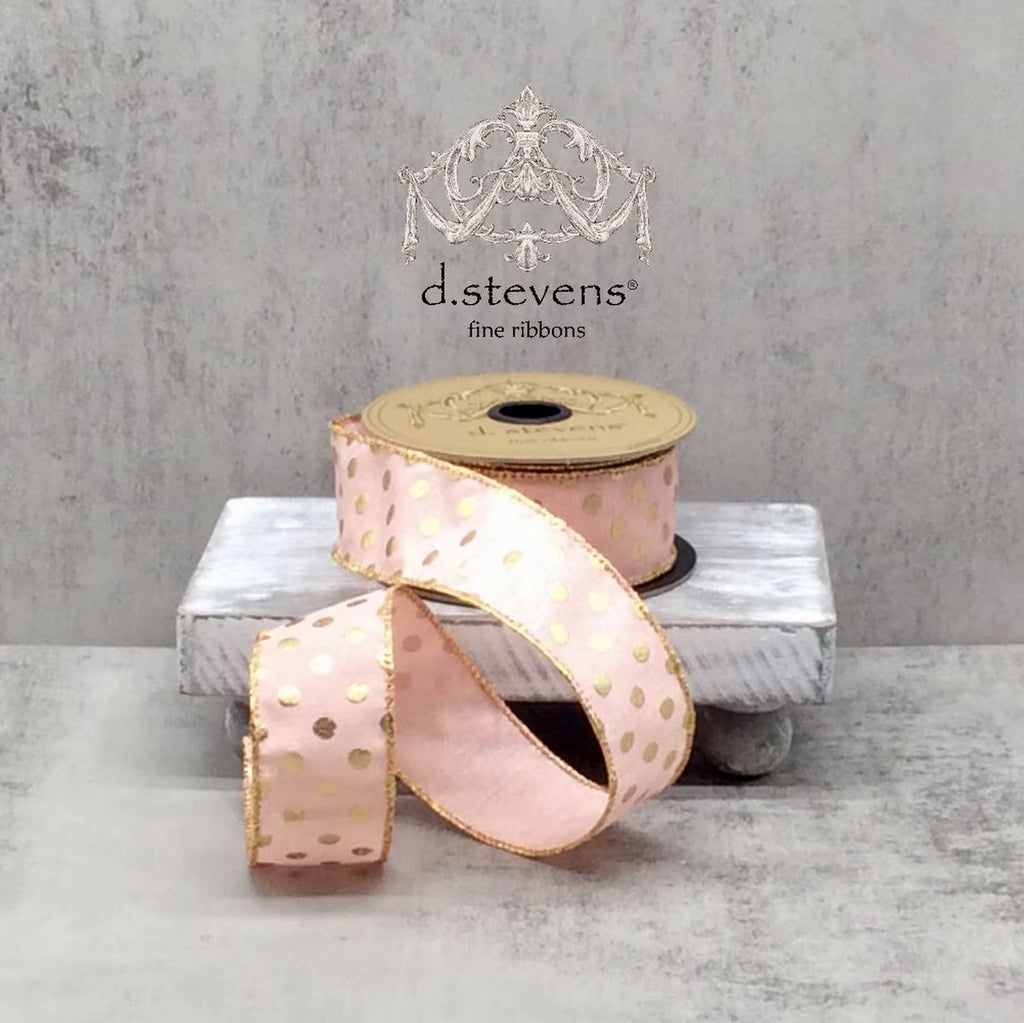 Add Sparkling Elegance to Your Creations Bring a touch of shimmer and sophistication to wreaths, bows, floral arrangements, gift wrapping, or décor with this Faux Dupioni Ribbon. The light peach base is accented with gold metallic polka dots, adding a festive, elegant flair perfect for weddings, spring projects, or celebratory crafts.