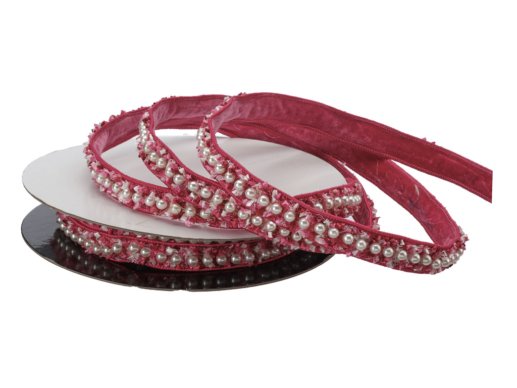 This rich velvet ribbon is the epitome of festive elegance, featuring a saturated hot pink base trimmed with hand-applied pearl beading along the edge. The result is a ribbon that feels both timeless and indulgently fashion-forward.