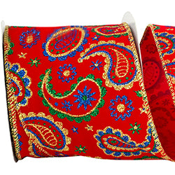 Infuse your holiday designs with rich texture and radiant color using our Paisley Velvet Jewel Tones Ribbon. Measuring 4 inches wide and 10 yards long, this wired-edge ribbon features an opulent red velvet base adorned with an intricate paisley pattern in vibrant jewel tones of sapphire blue, emerald green, and gold. The glimmering accents and bold design make this a standout piece for festive arrangements, statement bows, or lavish tree and garland embellishments. Ideal for those who love a bold, globally inspired holiday look with luxurious flair.