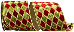 This luxurious ribbon showcases a festive diamond pattern in rich red and green velvet, set against a shimmering metallic dupioni backing. The wired edges enhance flexibility and shape retention, perfect for creating bold holiday bows, elegant wreaths, or premium gift packaging.