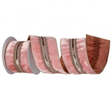 Infuse your décor with elegance and sophistication using this 4-inch x 5-yard Pink Velvet Ribbon with Gold Center Trim. Featuring luxuriously soft blush pink velvet, this ribbon is beautifully accented with an intricate gold trim running through the center, adding a refined, regal touch. The wired edges provide structure, allowing for perfect bows, draping, and decorative accents.
