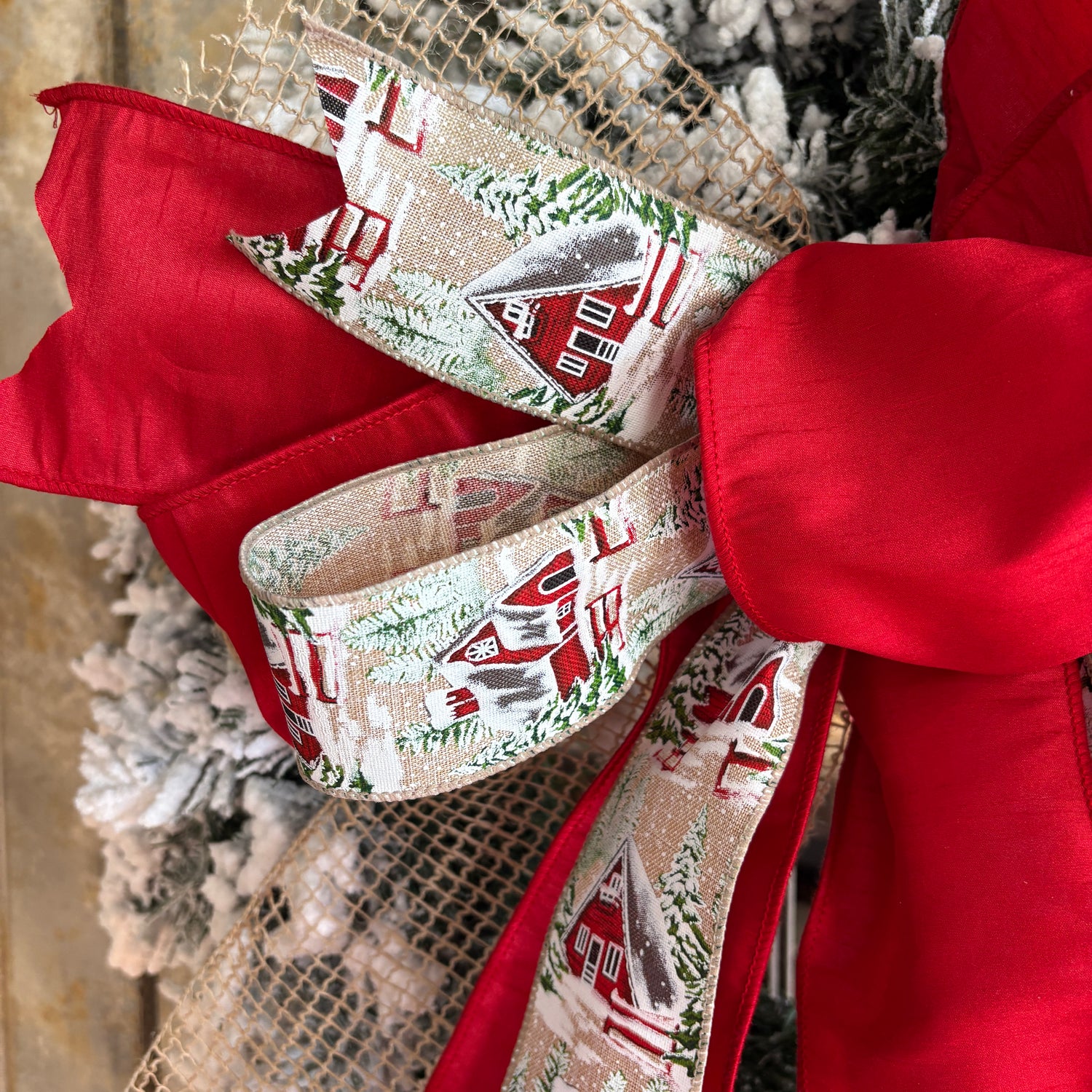 Rustic charm meets refined style in the Hearthside Holiday bow. This 18" x 22" design blends bold red satin, whimsical winter cottage ribbon, and a touch of gold mesh burlap for cozy texture. It’s the perfect piece to carry your décor through Christmas and into winter, evoking the warmth of fireside gatherings and snowy evenings at home. Beautiful on wreaths, lanterns, or as a statement on stair rails.