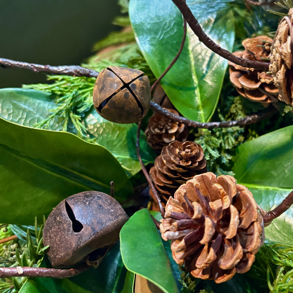 Features real-touch greenery, pinecones, rustic bells, and twig elements