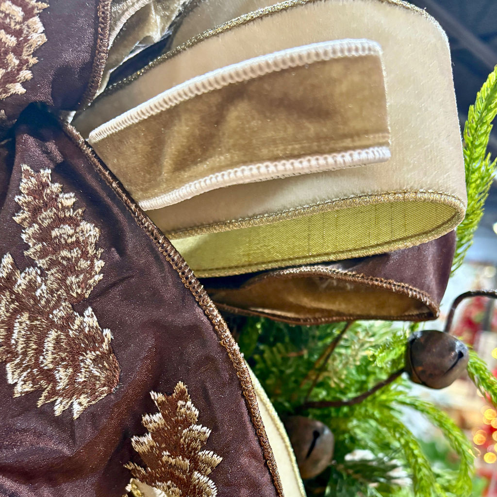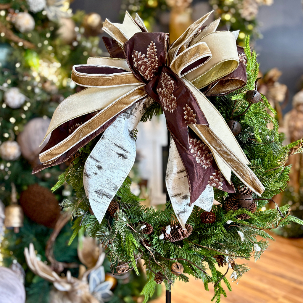 Invite the warmth and quiet elegance of the Smokies into your home with “Woodland Grace,” a 30" handcrafted wreath designed to embody the serene beauty of a mountain Christmas. Lush layers of real-touch greenery are accented with frosted pinecones, rustic jingle bells, and wild-harvest inspired textures—all crowned by a luxurious designer bow crafted with velvet, birch print, and embroidered pinecone ribbon.