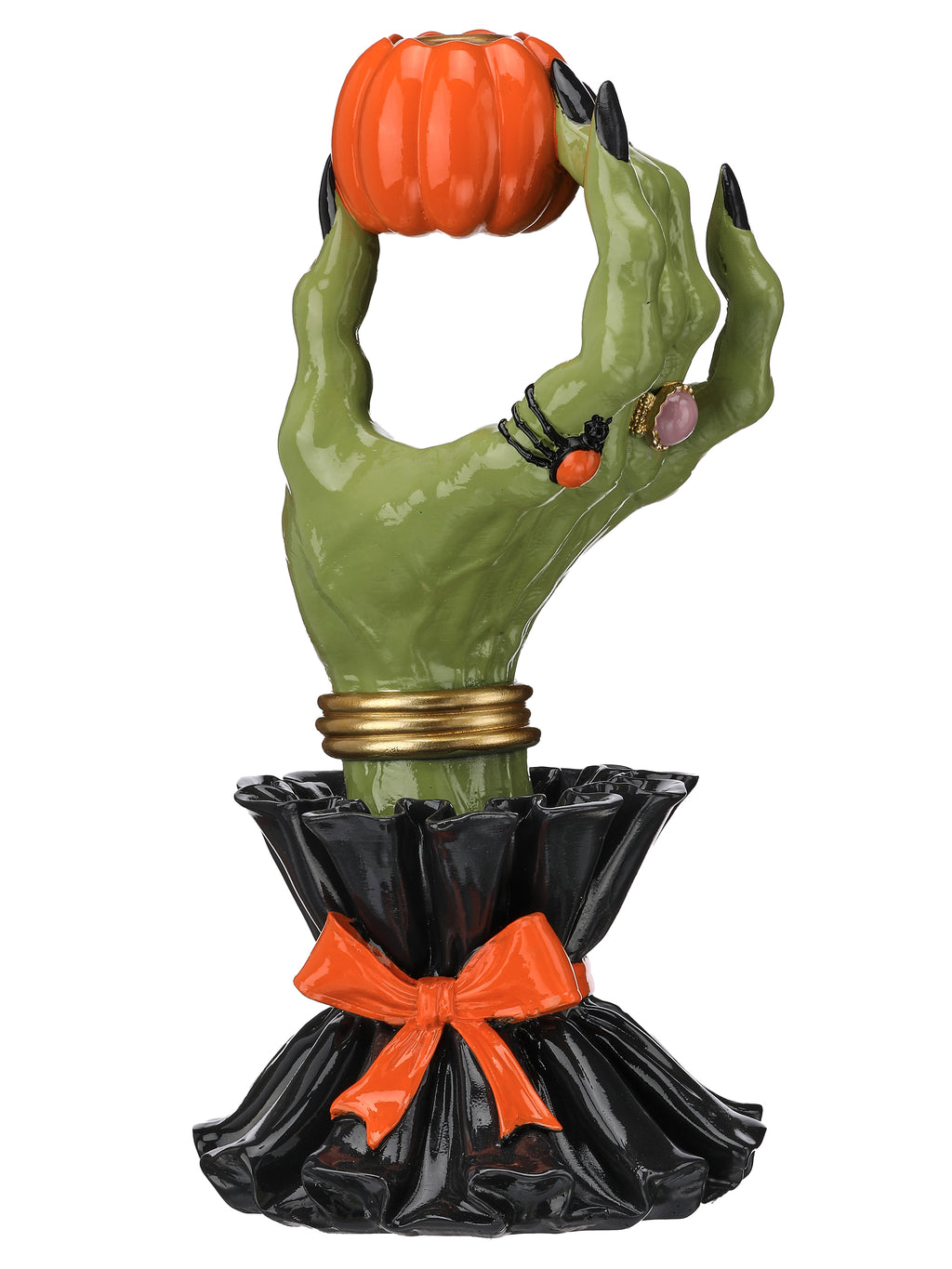 The wrist emerges from a dramatic black ruffled cuff, finished with a wide satin-like orange bow at the base, creating a vivid contrast and enhancing its theatrical appeal. Three metallic gold bangles encircle the wrist, lending a luxurious, slightly mystical touch. The piece is molded from durable resin with a high-gloss finish, giving it a polished and refined look while ensuring longevity. Perfect as a standalone decorative accent or a unique candle holder, this piece combines spooky and sophisticated design in one eye-catching form.