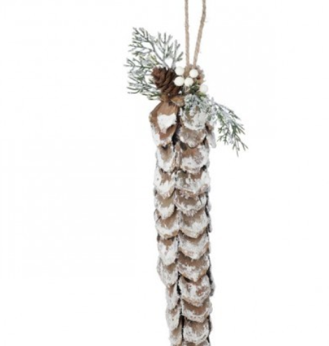 Indulge in rustic elegance with our 11.5" Snowy Sequoia Cone Ornament. Adorned with white berries and a touch of greenery, it exudes a sophisticated beauty reminiscent of a snow-covered forest. Elevate your holiday decor with this exclusive piece.