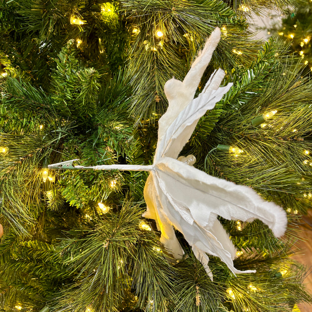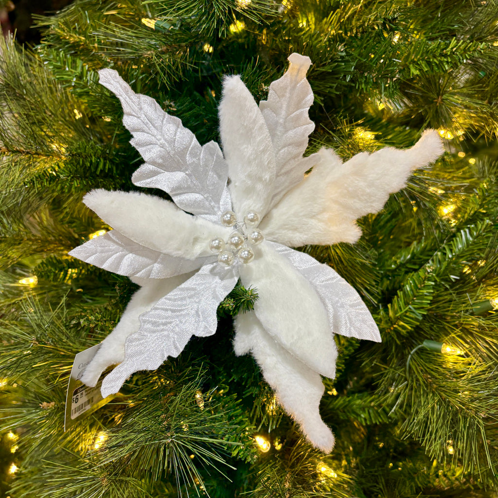 Add a touch of elegance and luxury to your holiday decorations with our Fur White Poinsettia. Crafted with exquisite detail and measuring 12" wide, it features a sturdy metal clip for easy placement. Transform any space into a stunning winter wonderland with this sophisticated and exclusive piece.