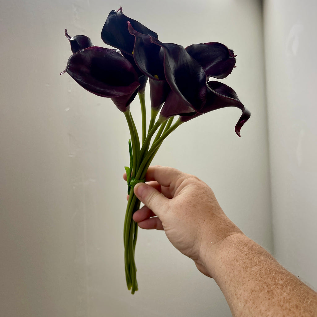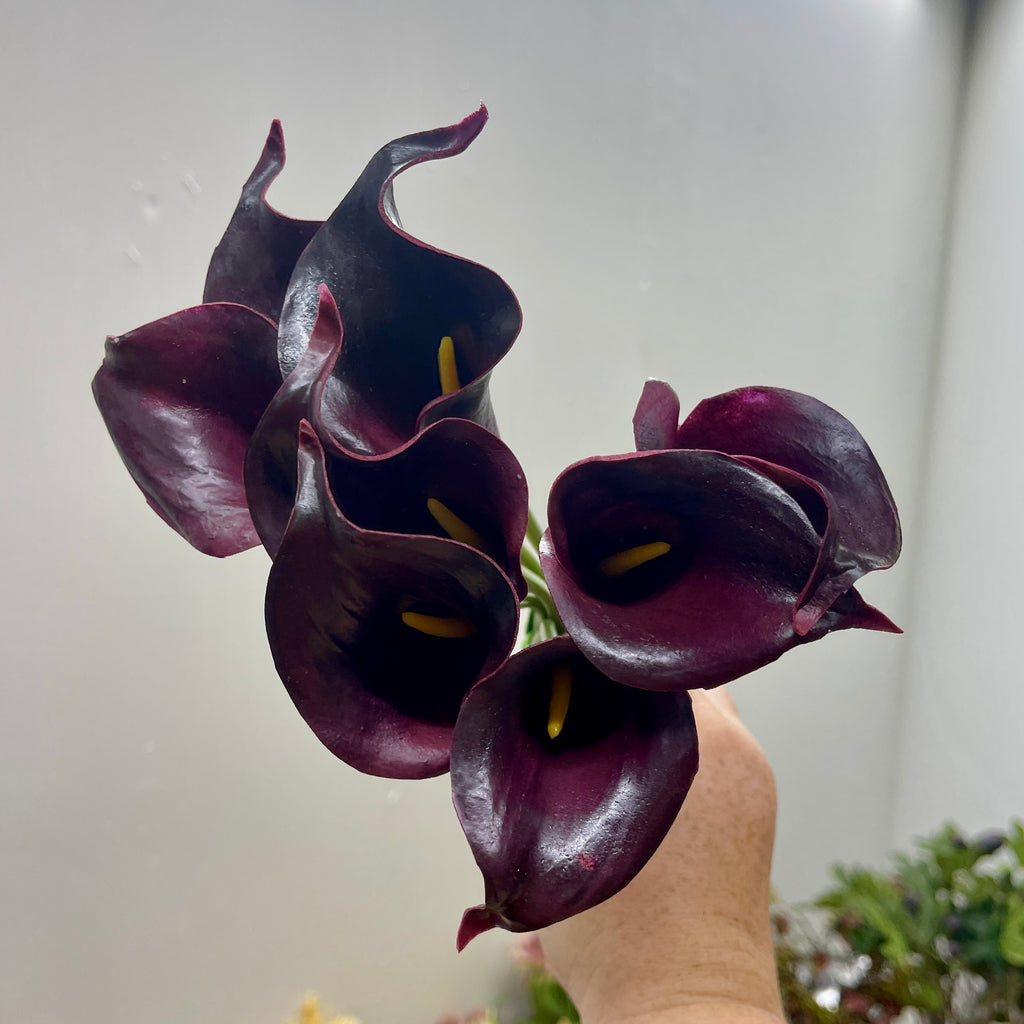 Add elegance and rich color to your arrangements with this 14" Mini Calla Lily Bundle in deep aubergine. Featuring 8 lifelike blooms tied together, this bundle is perfect for bouquets, centerpieces, or standalone displays. A timeless floral accent with a sophisticated, moody hue.