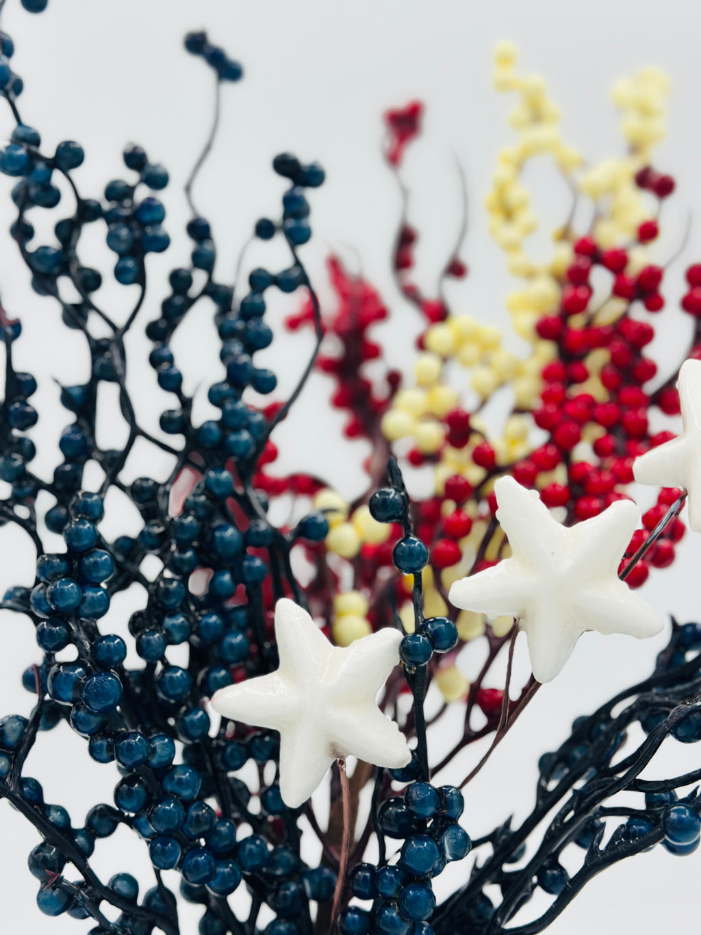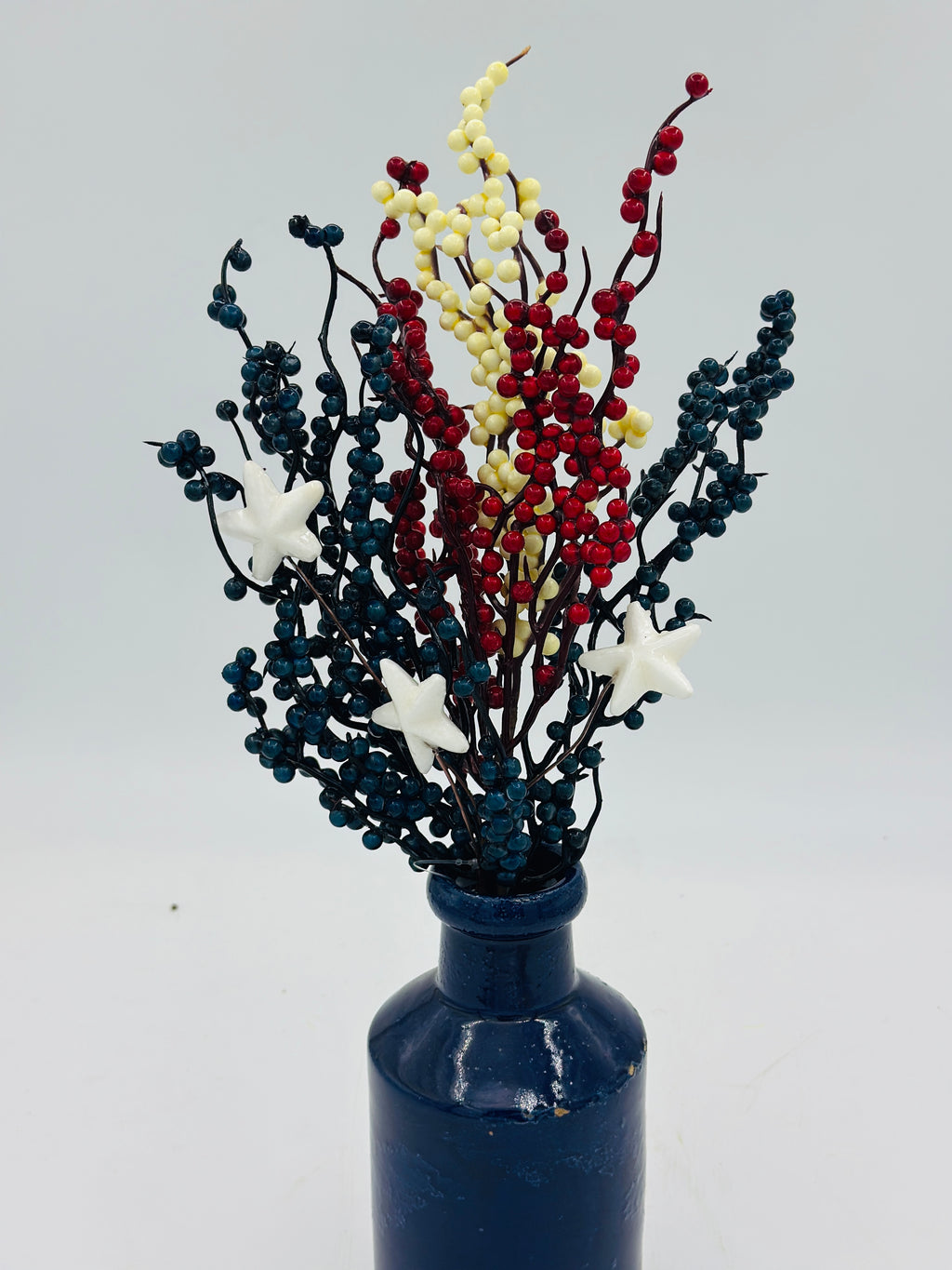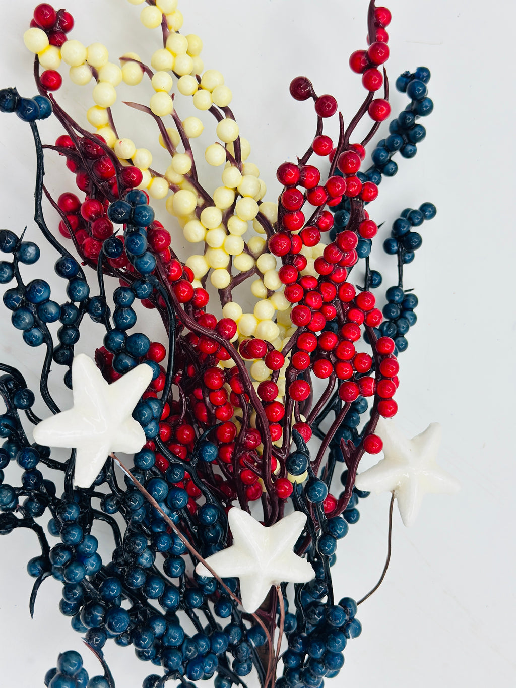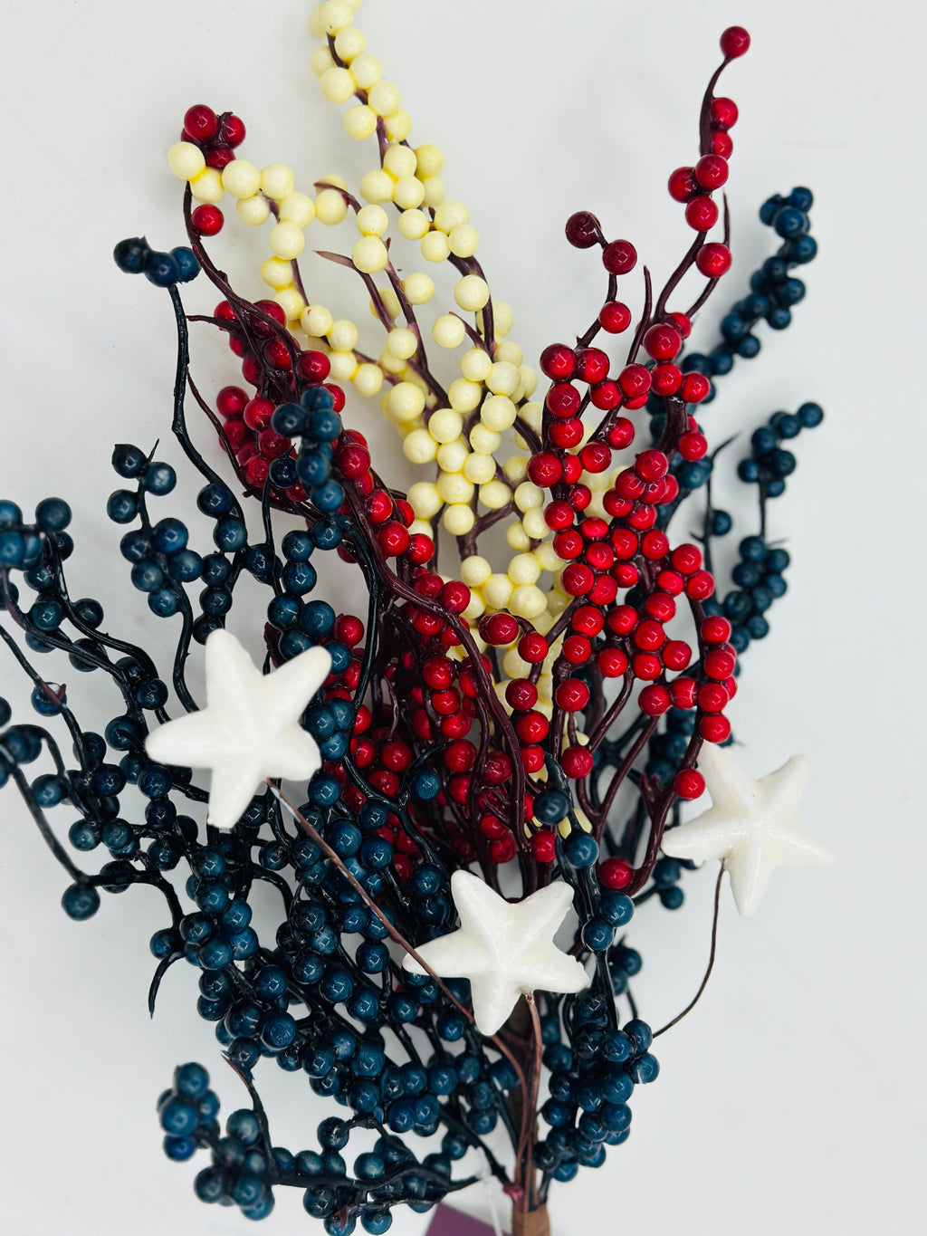 Add a patriotic and playful touch to your home decor with this 16" pick featuring vibrant red and blue berries and charming star accents. Perfect for 4th of July celebrations, Memorial Day, or anytime you want to show off your American pride. (Land of the free, home of the berry-picked!)